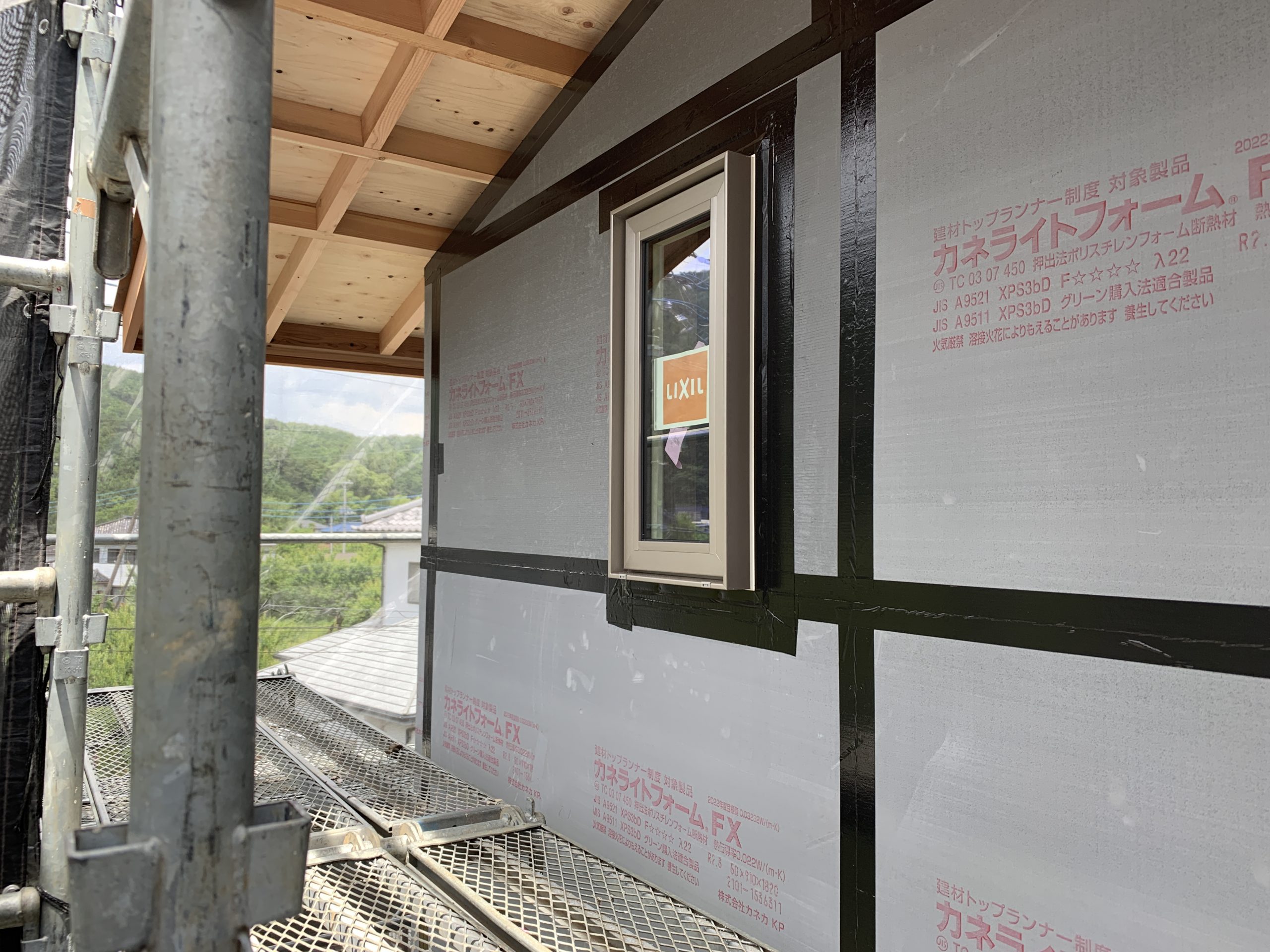 さて、越生町『四季を楽しむ家』は無事上棟し、屋根工事が終わり現在付加断熱を施工中です。明日からは外部の戸袋造作や胴縁も同時に進行していきます。