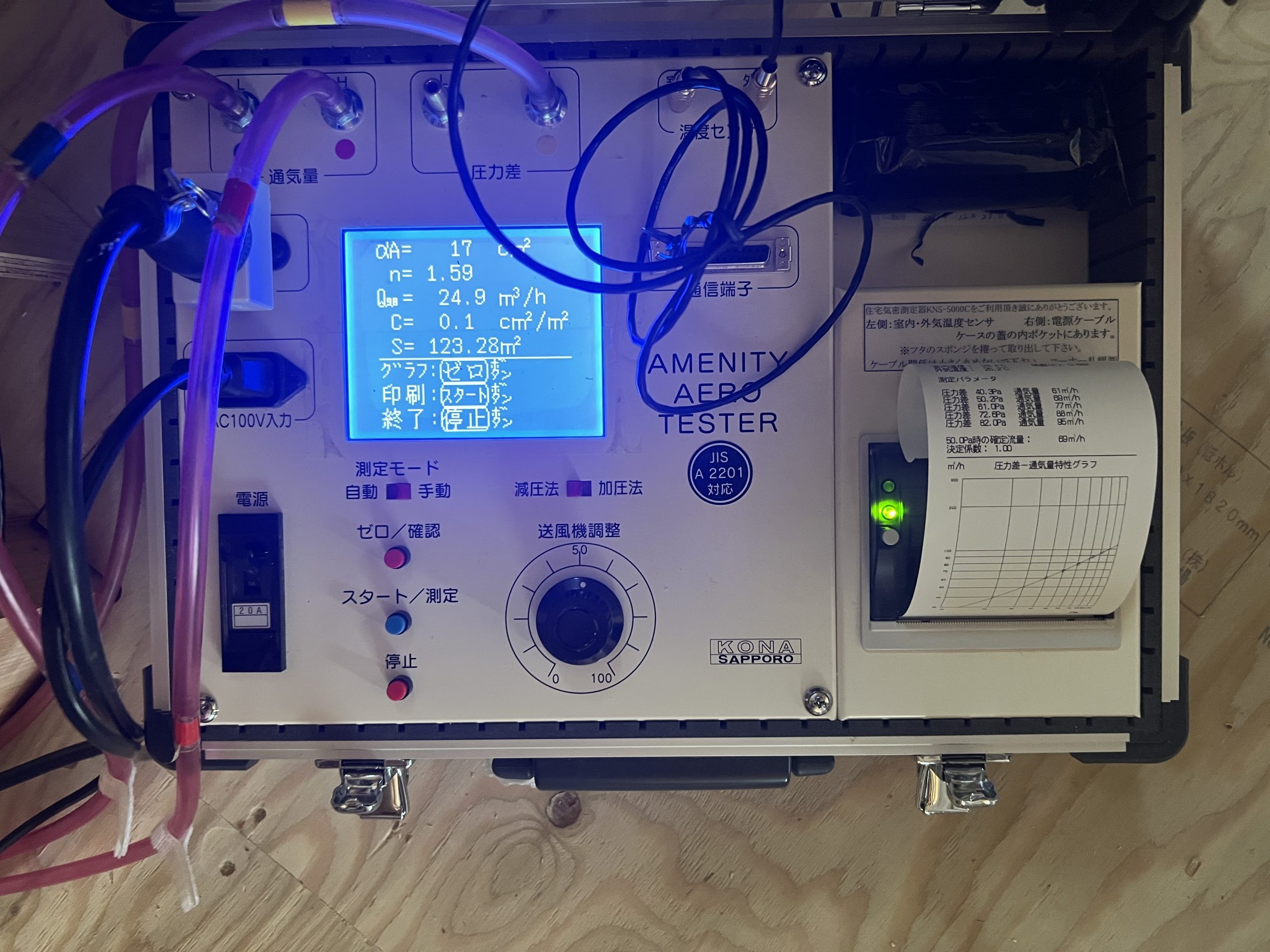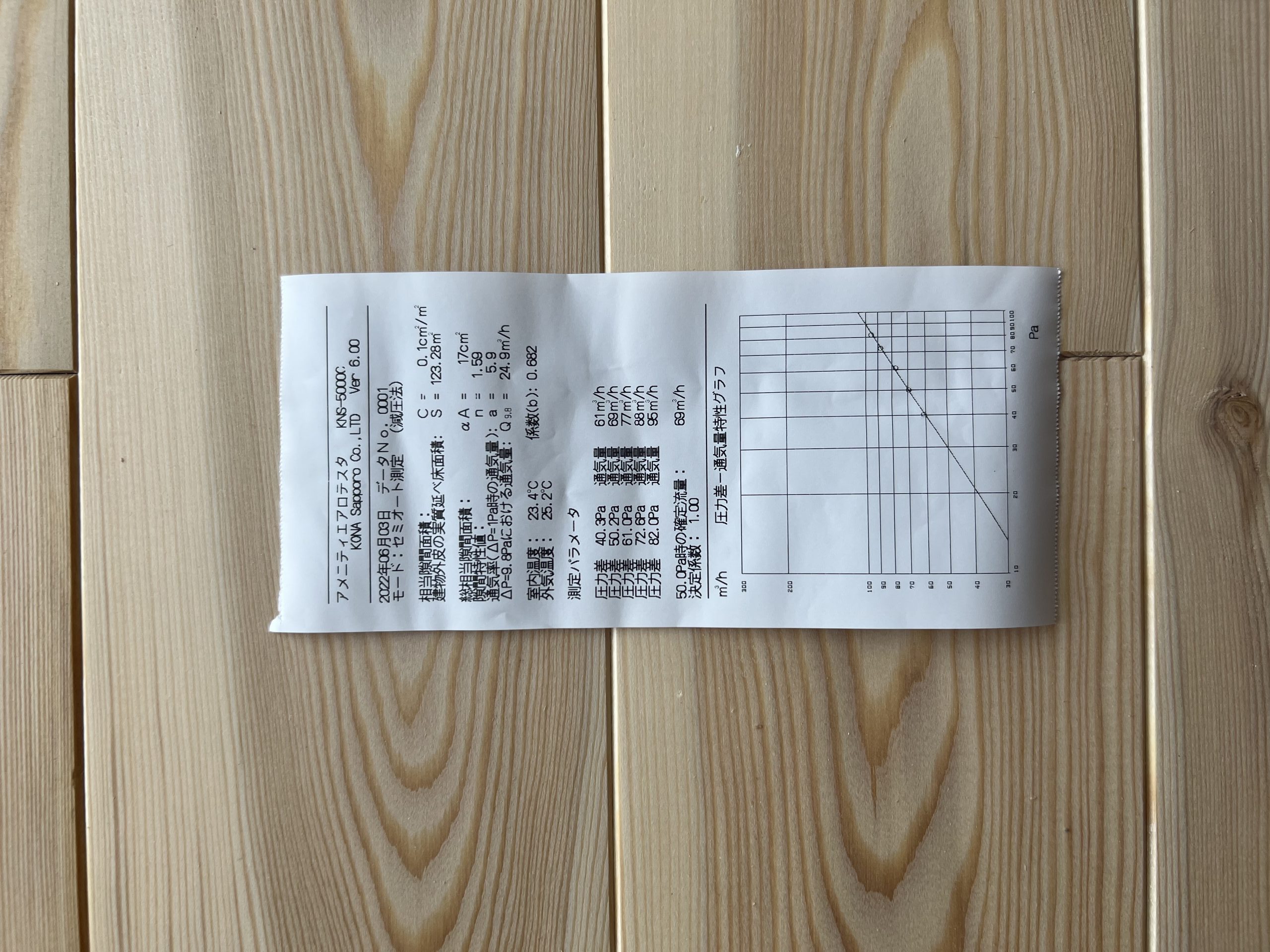さて本題ですが、『 やすらぎ の家 』の気密測定の結果は次世代省エネ基準の1/20弱となる0.13c㎡/㎡!