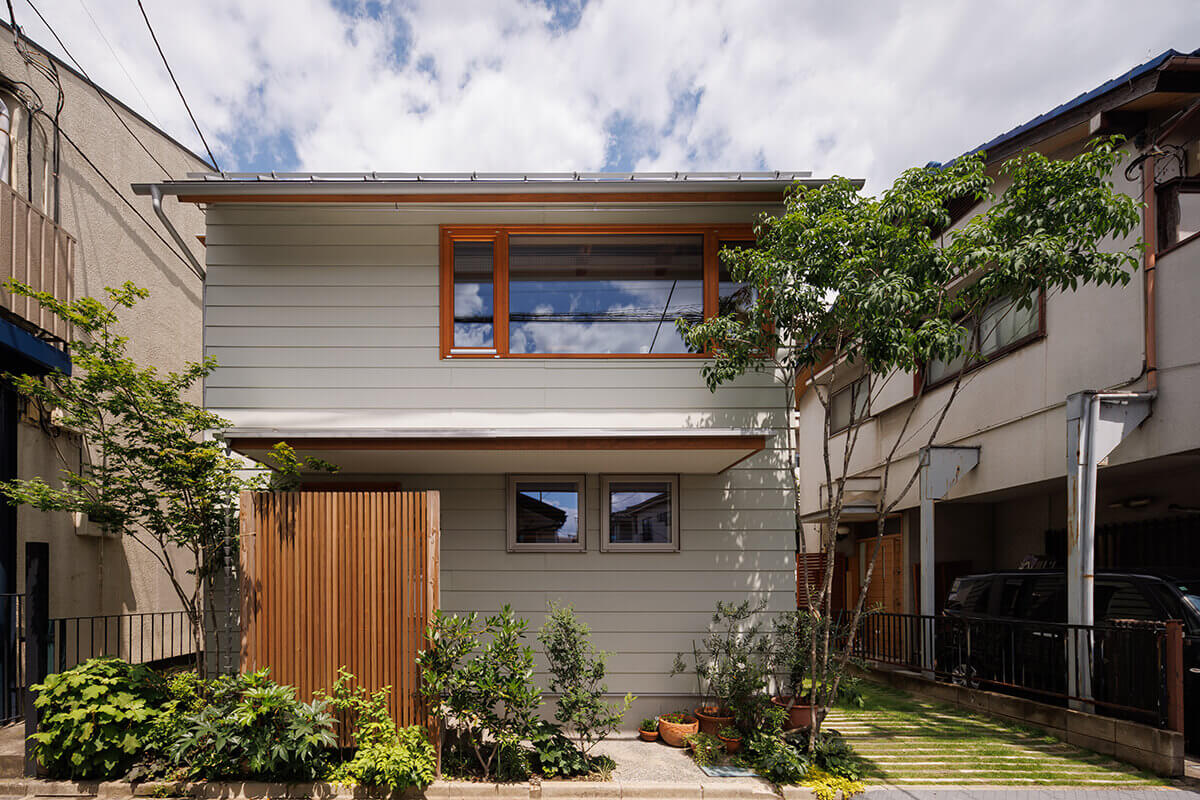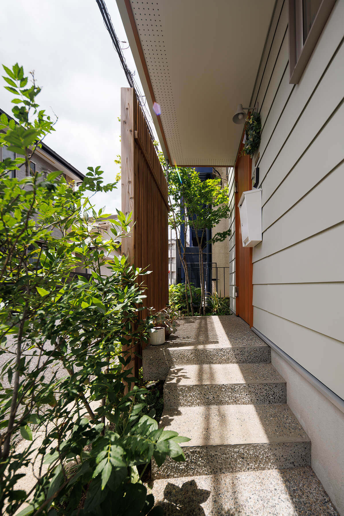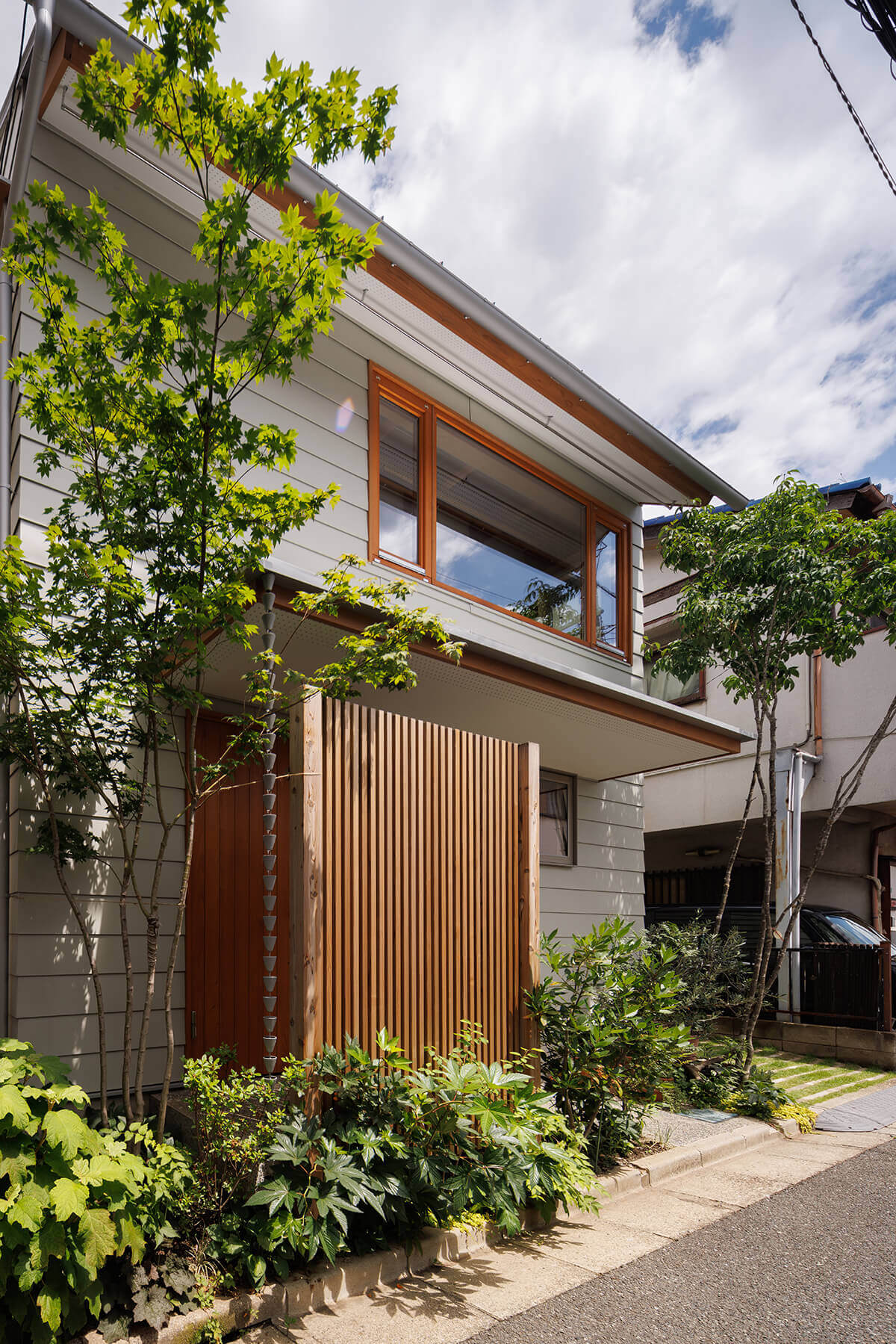 東京ゼロエミ住宅水準3/BELS/住宅性能評価:設計性能評価・建設性能評価 / 耐震等級3(許容応力度計算による) / 劣化対策3/断熱等性能等級6/一次エネルギー消費量等級6 / UA値0.31W/㎡K / C値0.05c㎡/㎡住宅や集合住宅が立ち並ぶ街並みは、緑も少なく殺伐とした印象が大きかったです。そのため、狭小地でありながらも、外構・植栽を含めて通る人々や窓から植栽が楽しめるように配置計画を行い、緑を感じられる優しい印象に変えることができました。