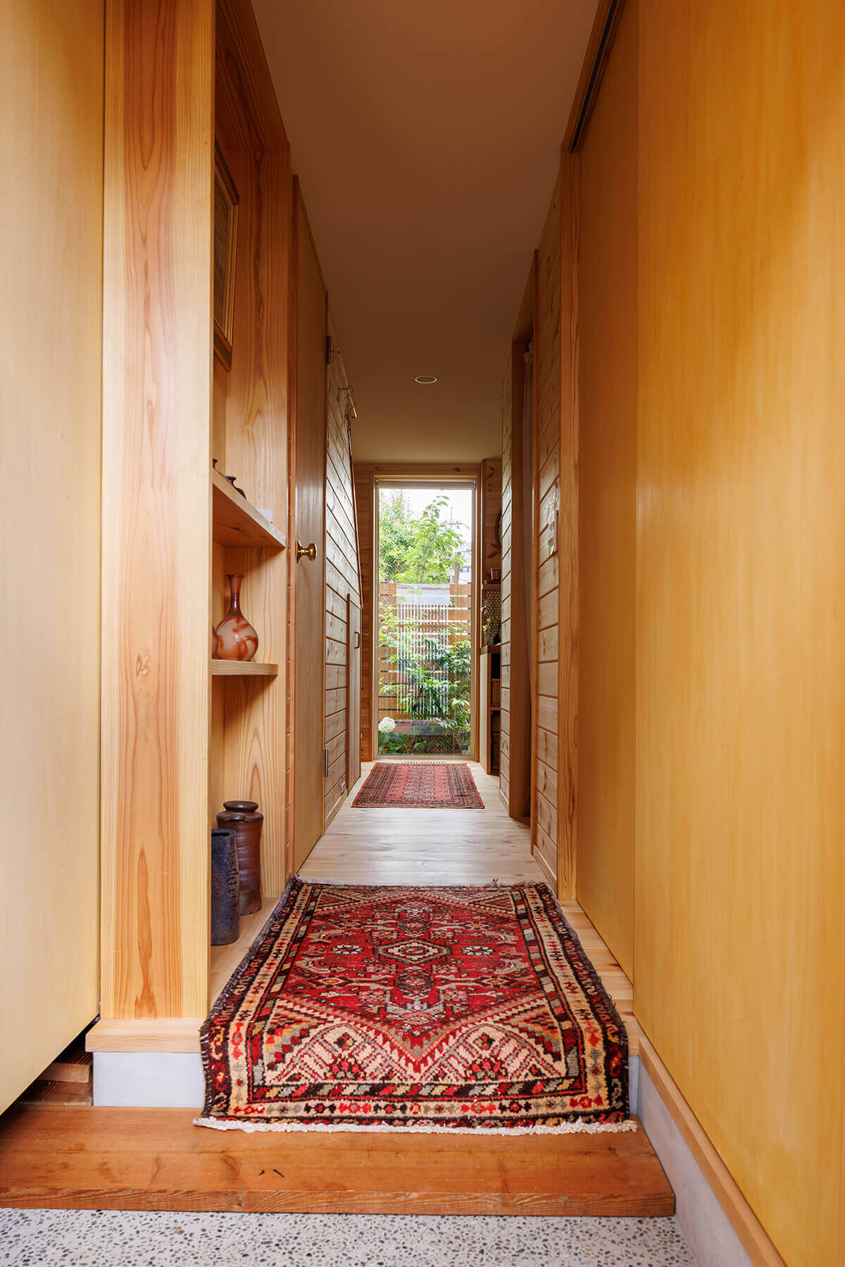 メイン開口の木製サッシは露地に向けて計画しているため、カーテンが無くても安心していられる心地よい開口部となりました。