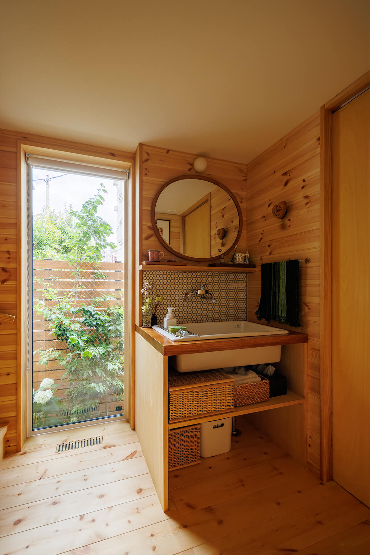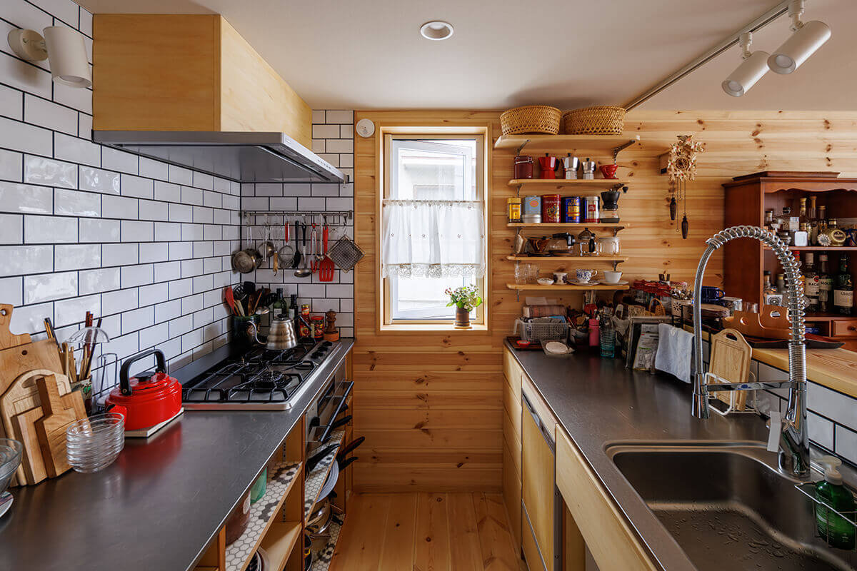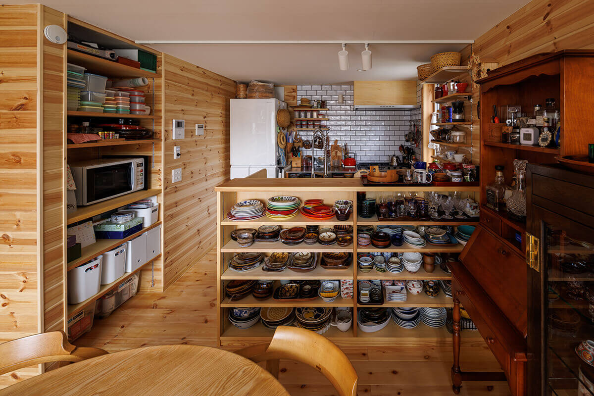 キッチンを始め、手洗いやニッチ本棚、家電収納など多くの造作を棟梁がこなし、最適な形で収まっています。