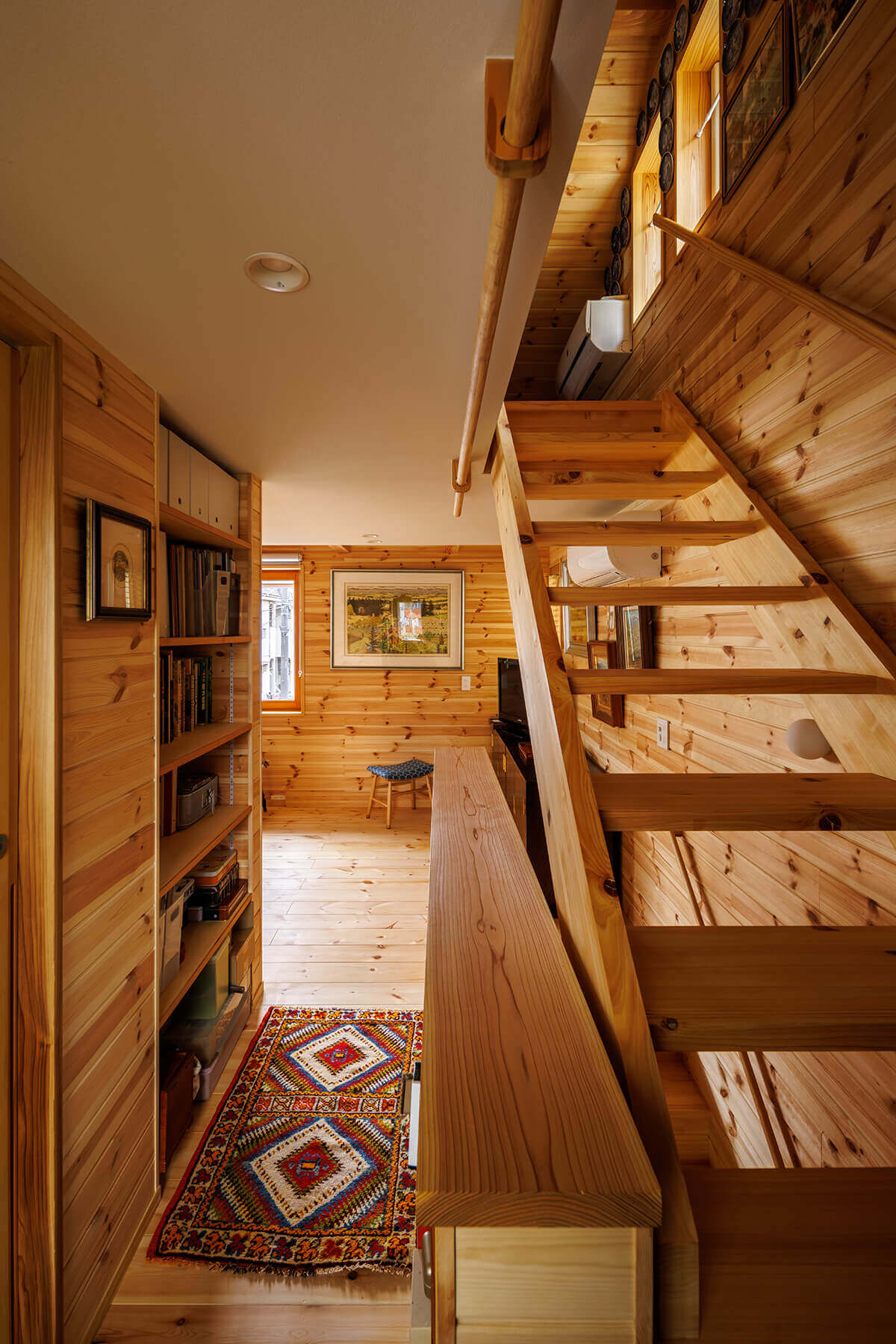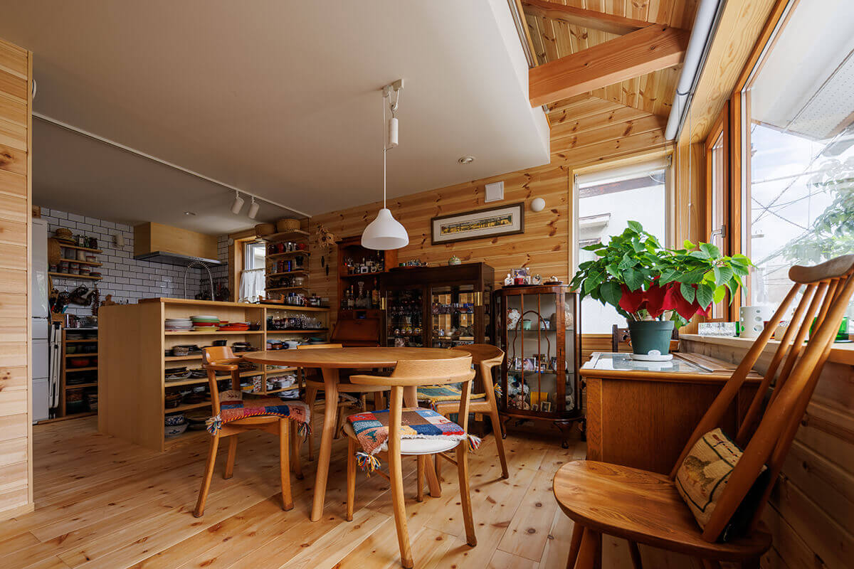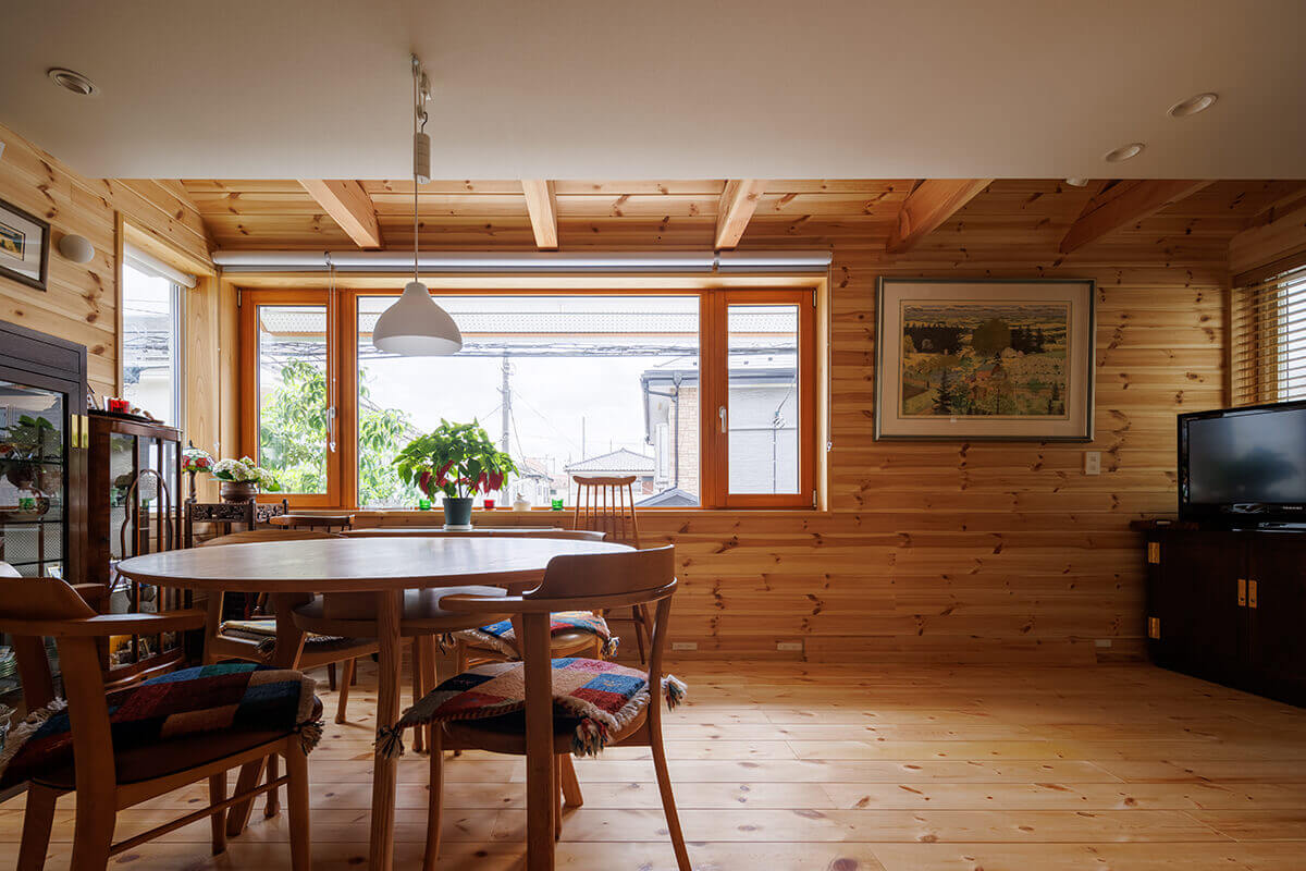 クライアントが所有している別荘の雰囲気をこちらでも味わいたいとのことで、床、壁、勾配天井にはパイン材を使用いたしました。