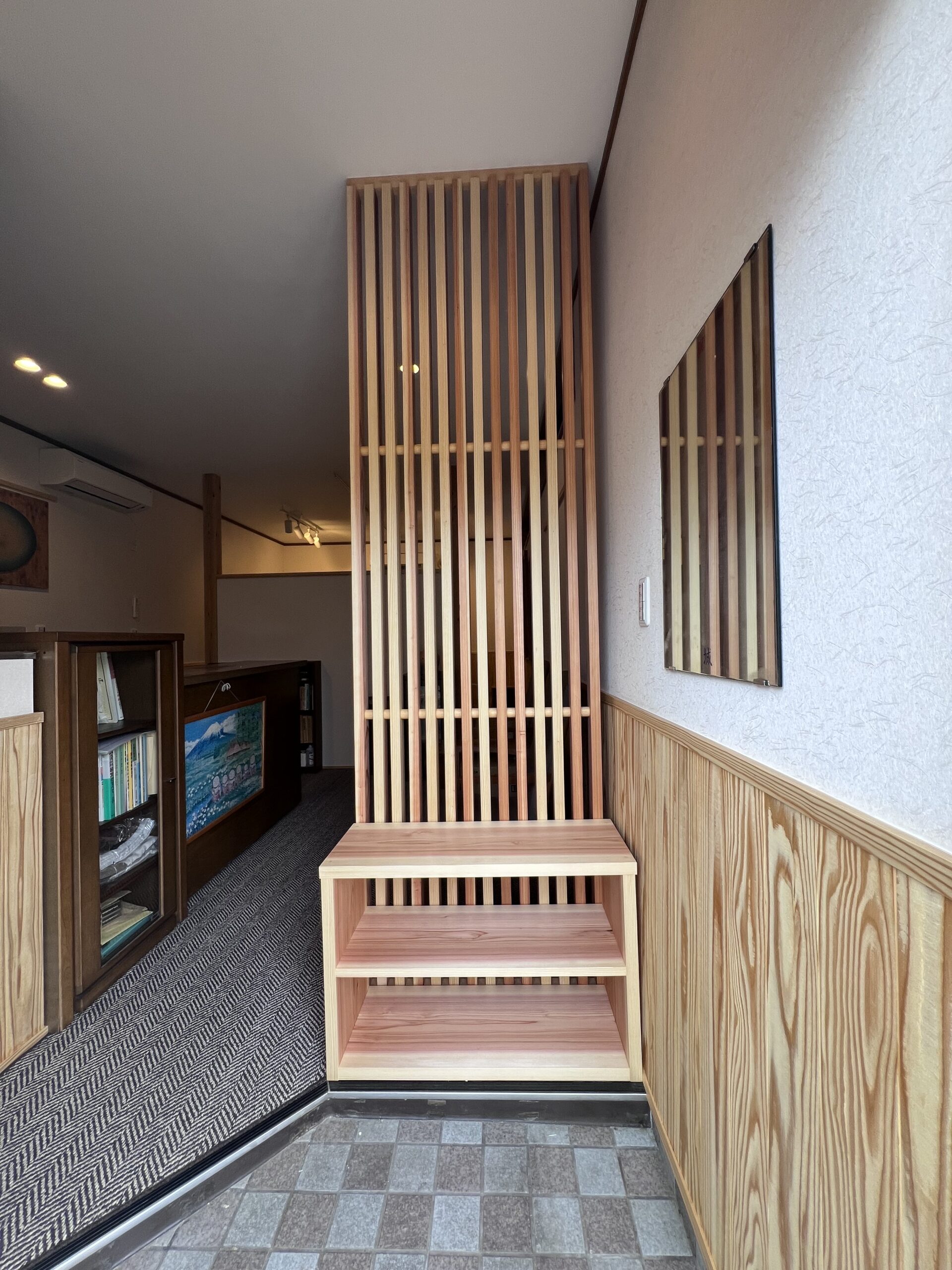 木のぬくもり感じる施術室にしたいとの事で、腰壁や格子に無垢の杉材を使用させていただきました。