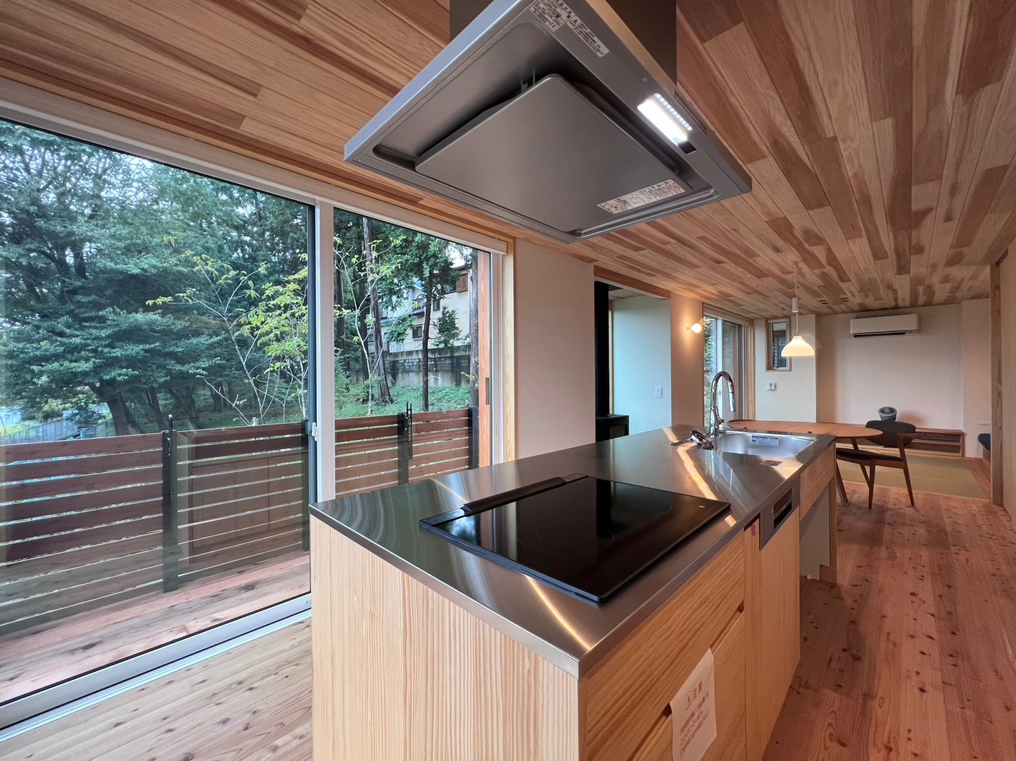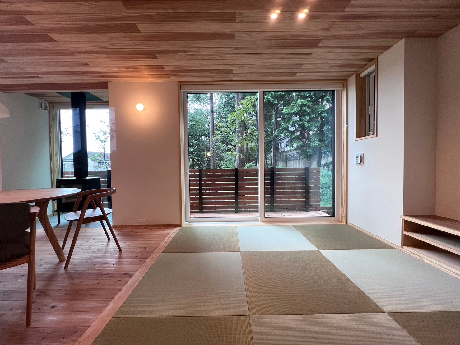 畳リビングから保存緑地を望む 冬には薪ストーブも楽しめます。