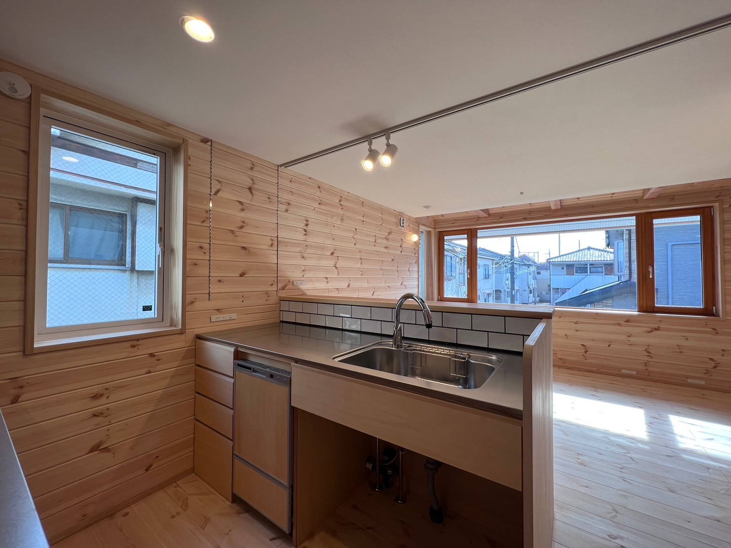 大工さんの作ったキッチン キッチンに建つと南東の抜けがきれいに望めます。春になると植えたアオダモの葉が望めます。