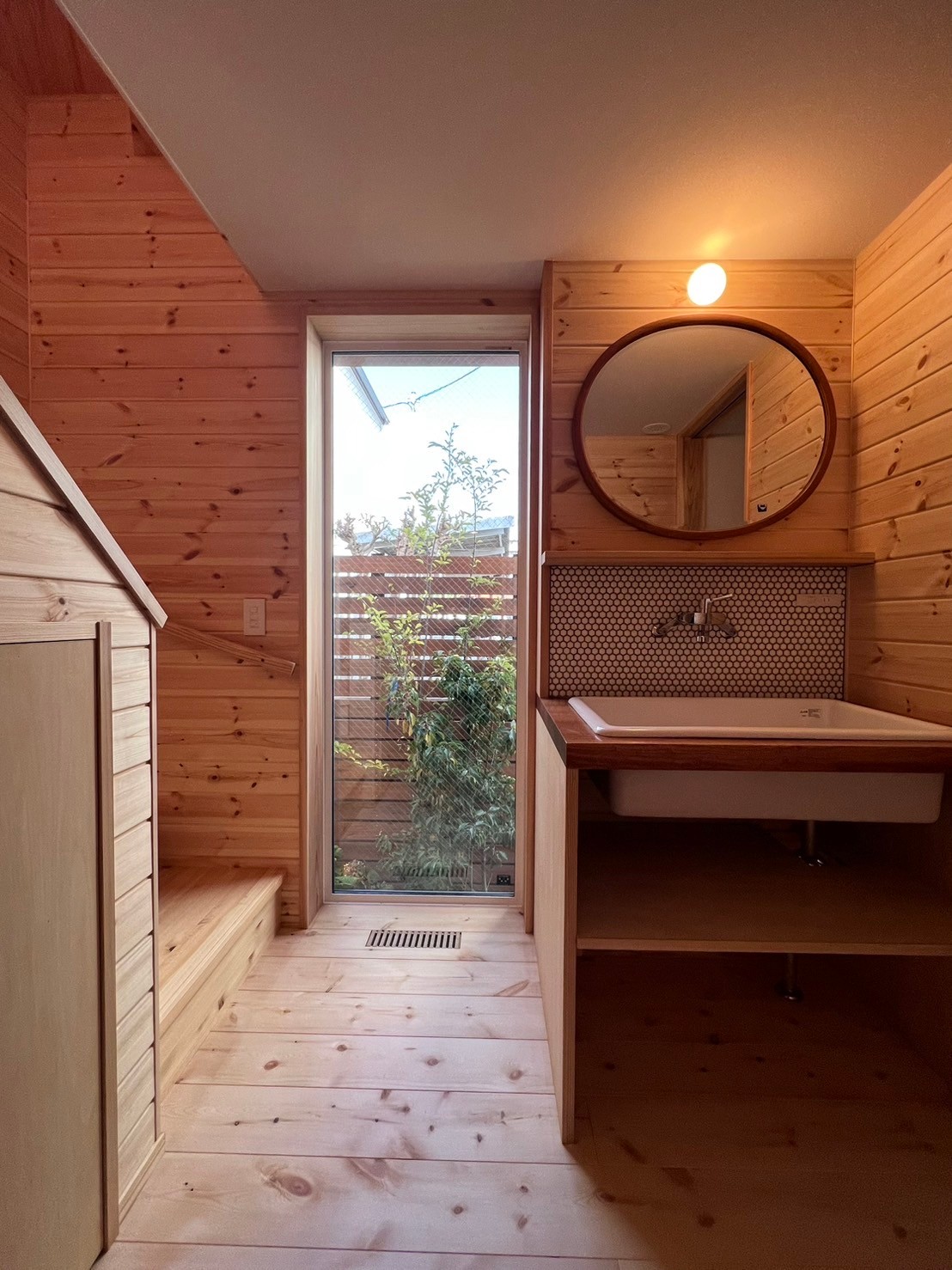 前のお家で使っていたケヤキのテーブルを使った洗面カウンター 鏡は化粧台から外したものを取り付けました