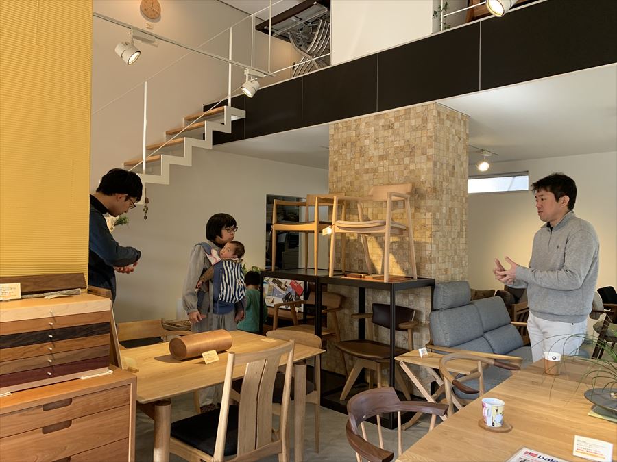 こなから建築工房では家具やカーテン、ブラインドなども全て一緒に提案させていただきます。今回は入居に合わせて椅子を選びに三芳家具さんにお伺いさせていただきました。