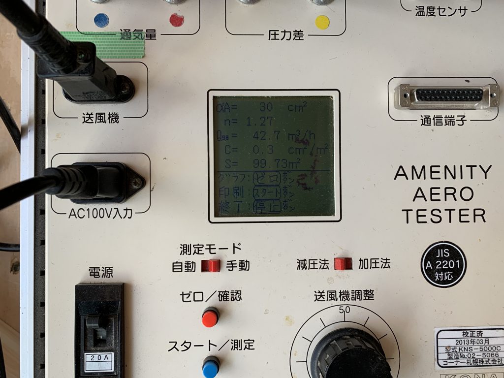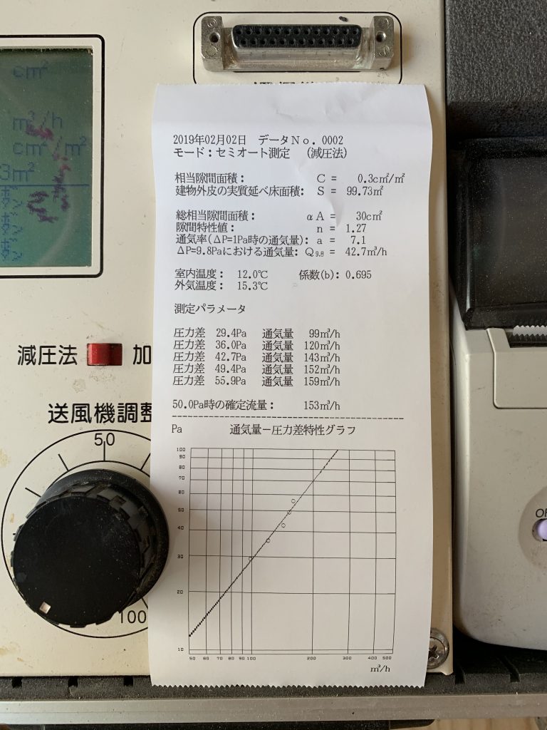 さて本題ですが、『飯能の家』の気密測定の結果は次世代省エネ基準の約1/7となる0.30c㎡/㎡!