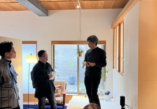 岩崎駿介氏にウッドデッキの上で、『落日荘』が出来るまでの過程を土地選びから丁寧に教えていただくことが出来ました。