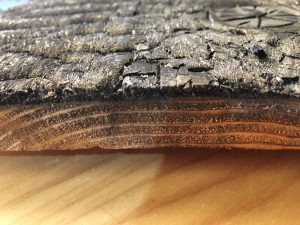 一般的な焼杉は厚みが9mm程度などに対し、当社で採用している焼杉は18mmと十分な厚さがあり、反りや割れも少なく炭化部分を深くできるため