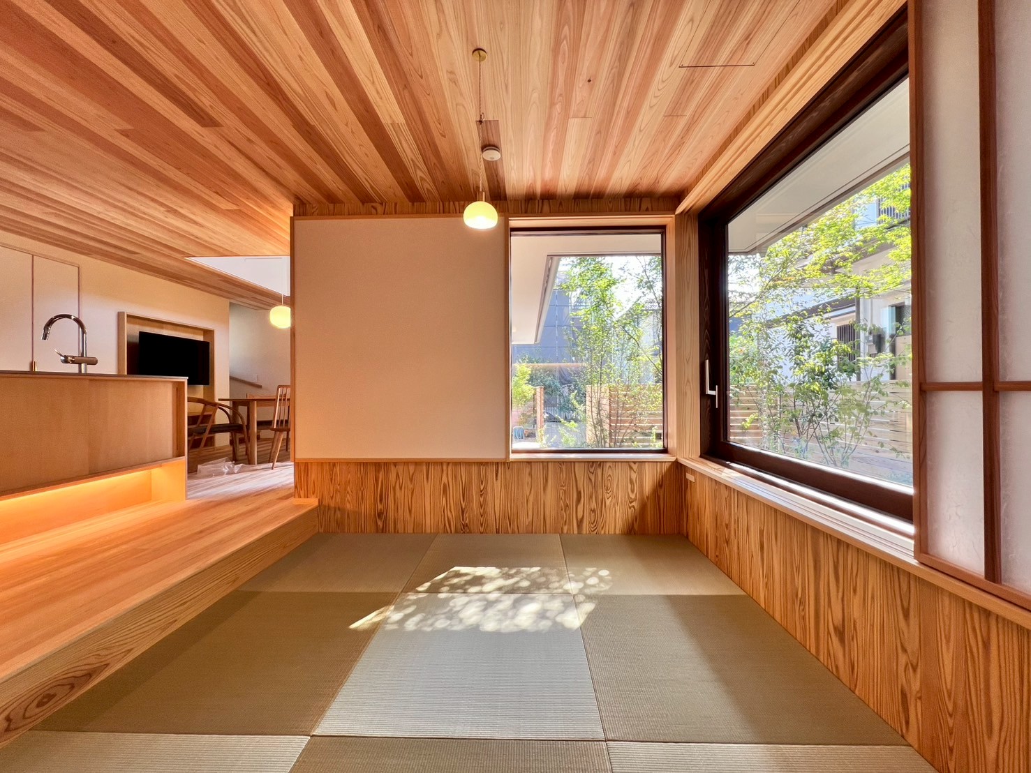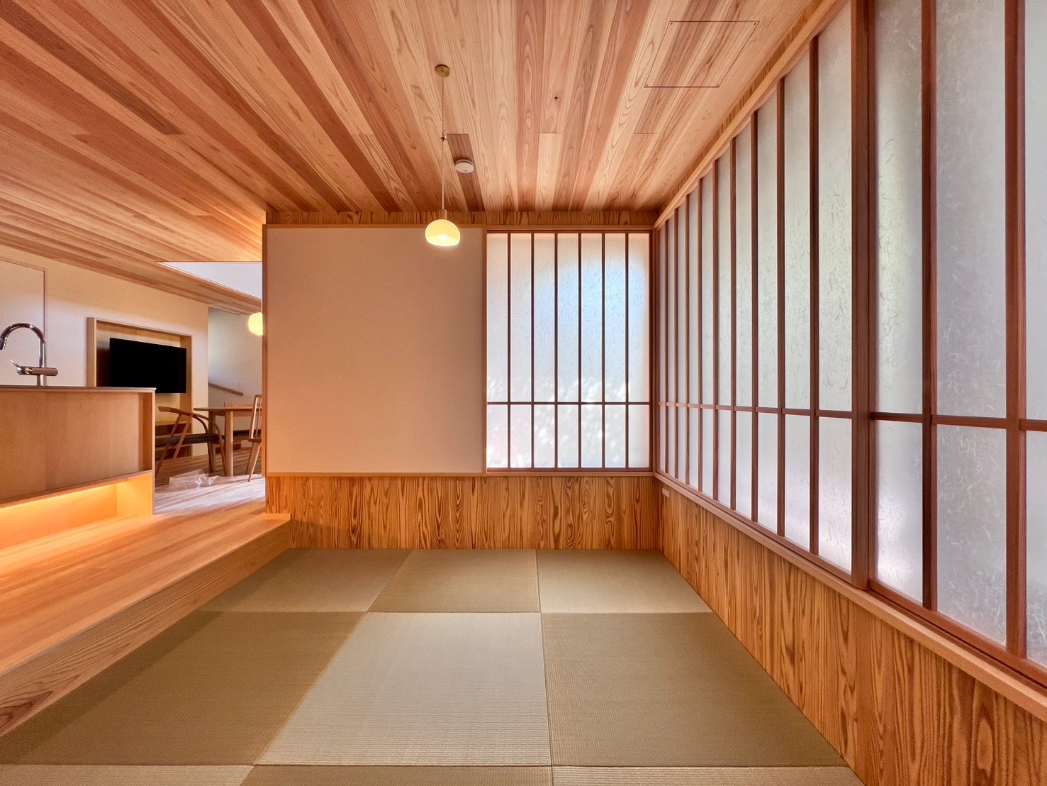 障子の開閉だけで室の使い方が変わってくる。天井は埼玉県飯能市【西川材】杉を使用。