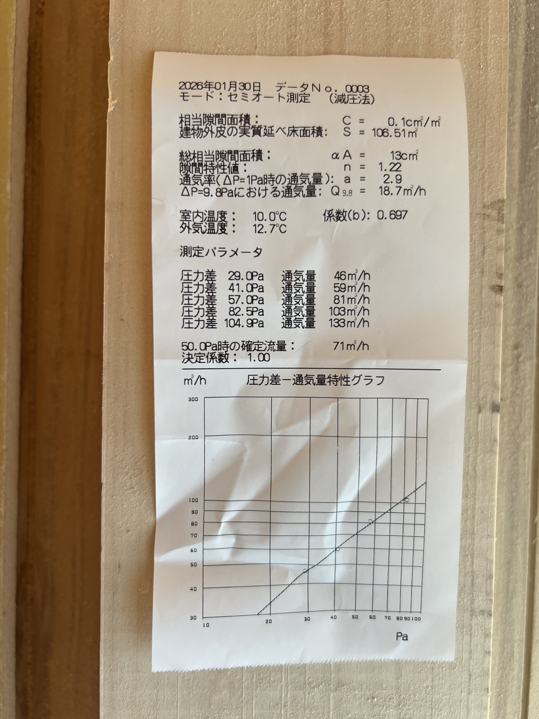 先日、所沢市で建築中の「くの字の家」にて気密測定を行いました。