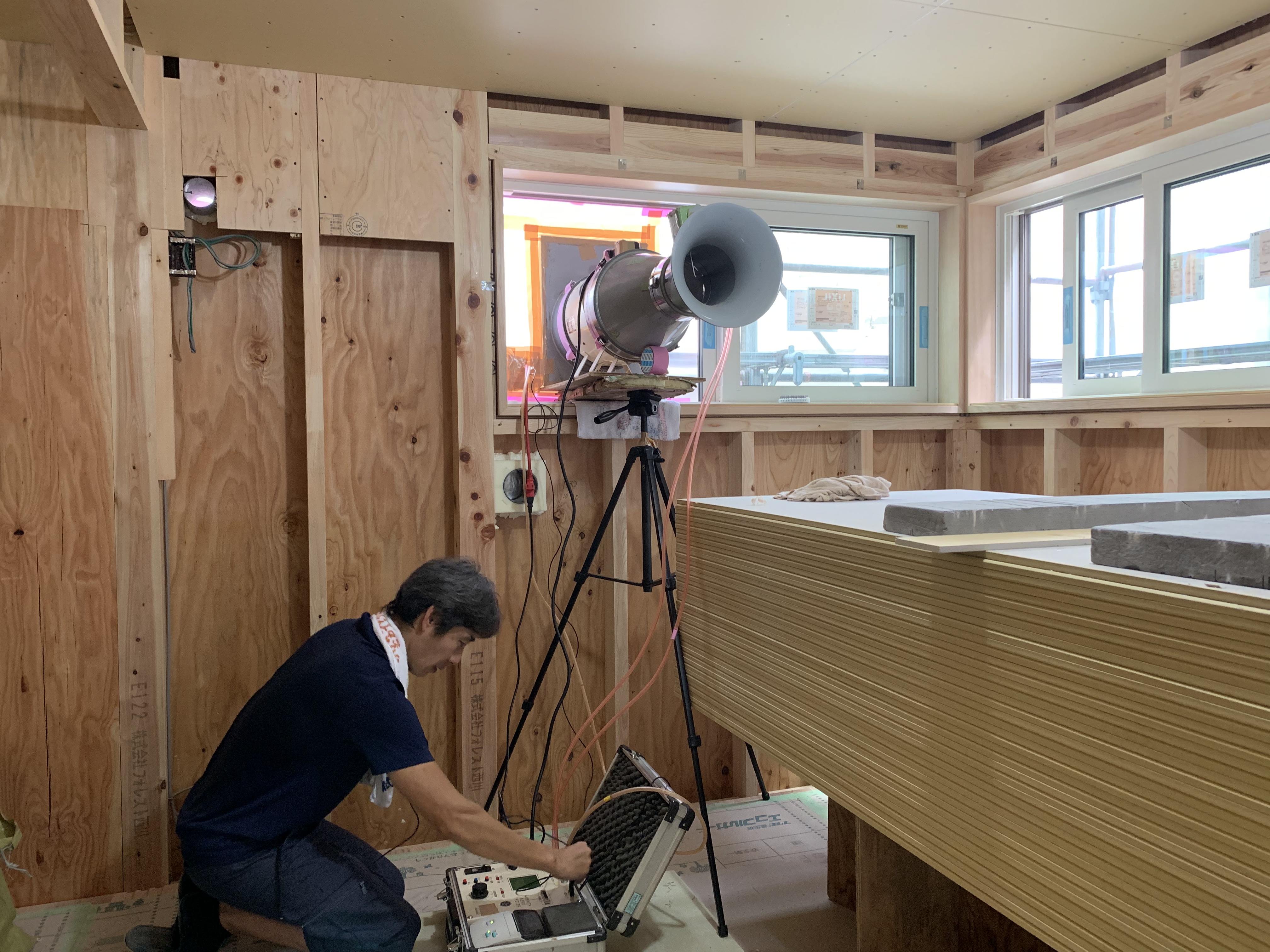 『狭山ヶ丘の家』では外張り断熱材の施工も終わり、サッシが入り電気や設備配管も終わったため気密測定を行いました。