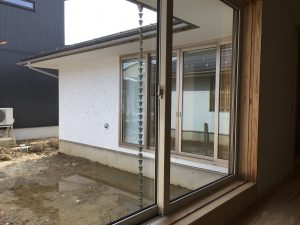 玄関横のビルトインガレージに設けられた格子からは中庭が望めます。この日は大雪のため庭作りが遅れてしまい、