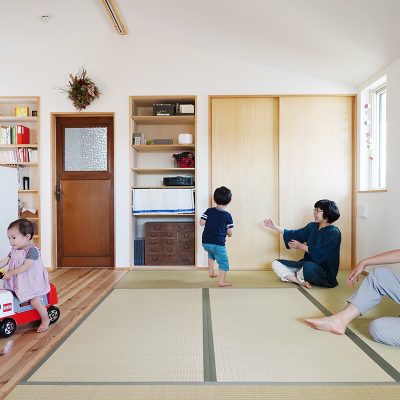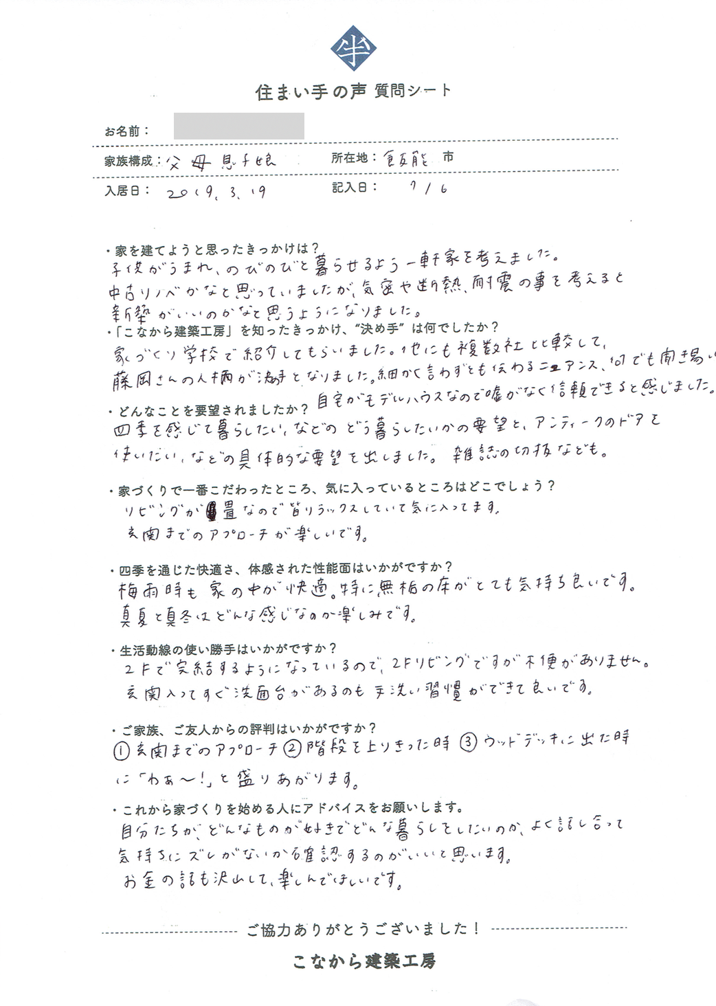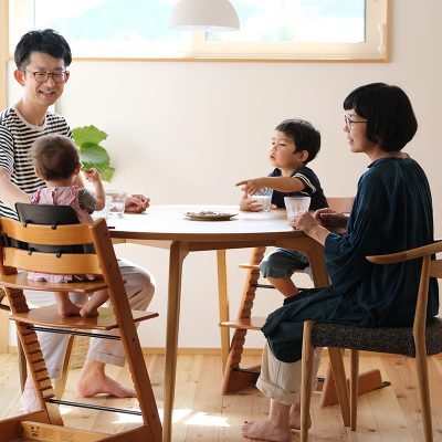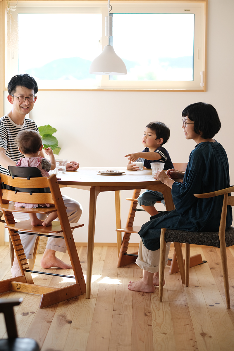 山を見て暮らしたかったので、二階リビングにして正解でした。寝室以外は二階に集約したのでとても暮らしやすいです。あとアプローチですね。玄関位置を変えてもらった甲斐がありました。ダイニングからすぐに出られるバルコニーも子供たちもとても気に入っています。暮らされての感想は?