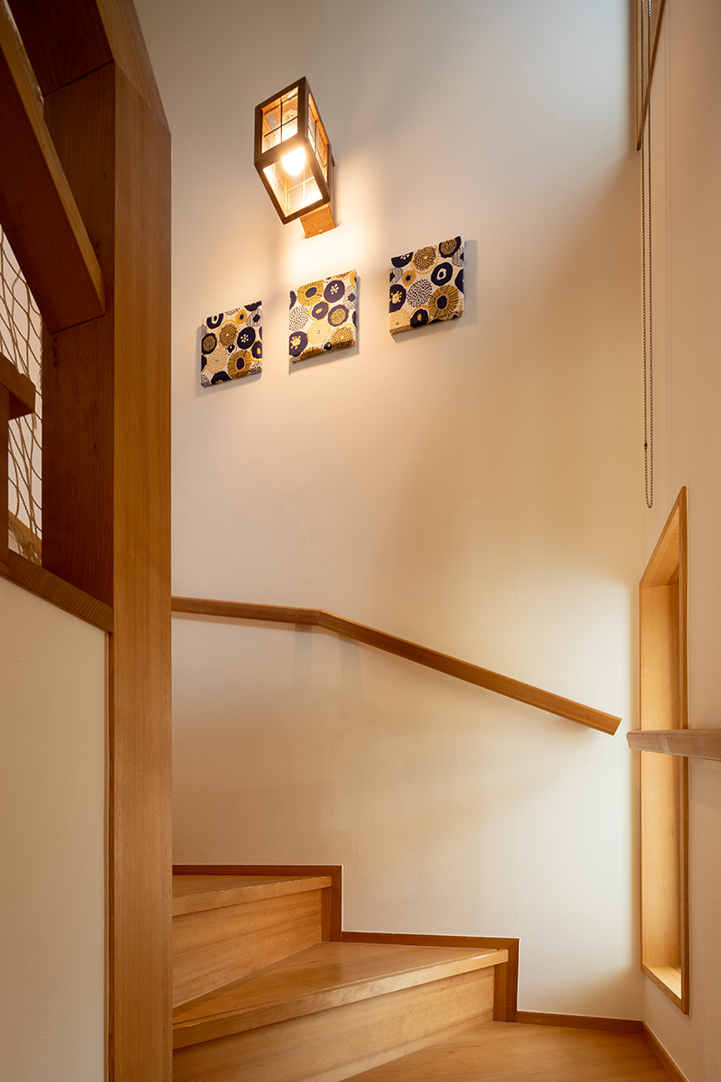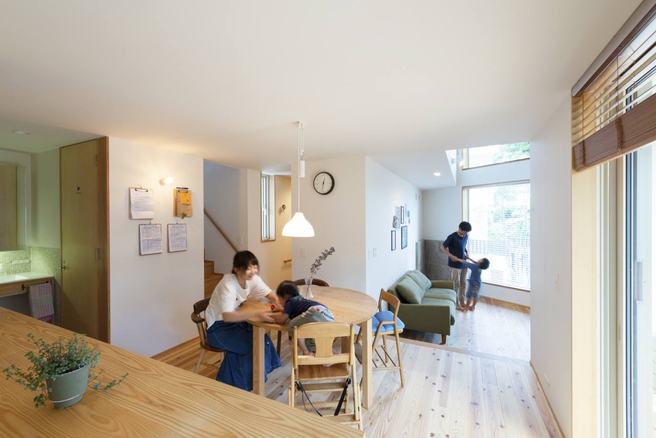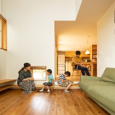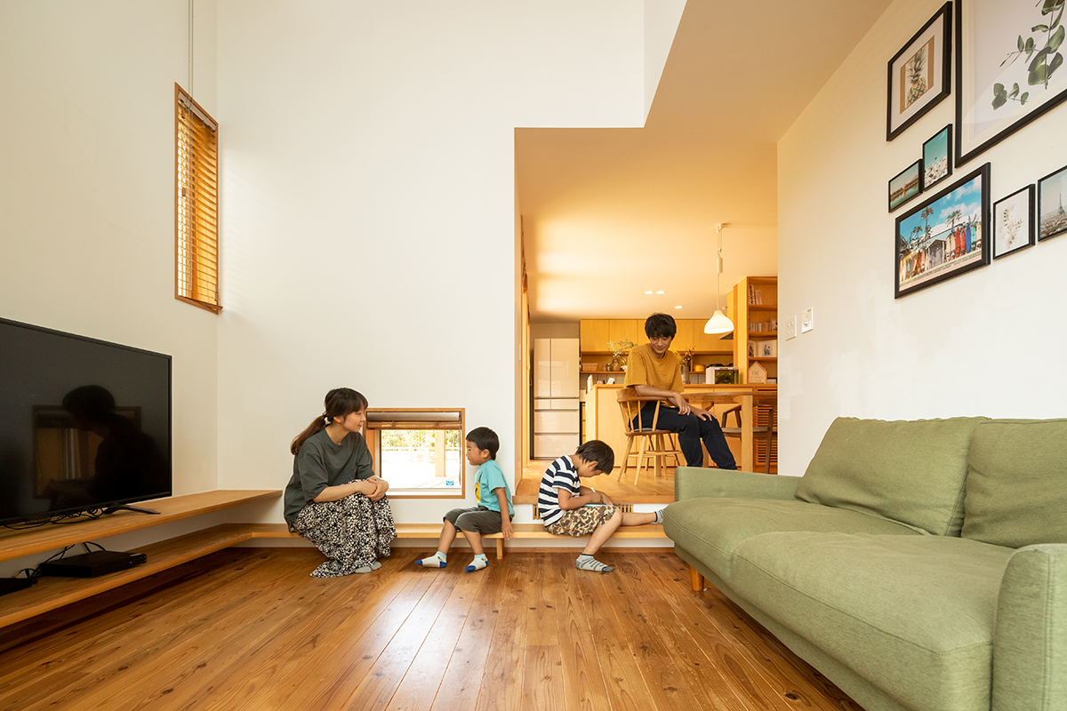 自然の風を利して、夏涼しく冬暖かい家である点です。また、ヒートショック現象のことも考え、どこにいても出来るだけ同じ室温になるようにしたい点もこだわりました。 気に入っているところはいくつかあります。まず、動線が斜めになっているところです。斜めの動線だと横よりも長さがあるので、本当に広く感じます。次に、天井高の高低差で実際の大きさよりも家が大きく・広く感じるところです。(藤岡さんが3D視点で考えていただいたからです。)最初、藤岡さんが通常の天井高を2m20cm(通常のアパート高や一般的な住宅の天井高いは2m40cm)にしたいと提案いただき、1m80cmの私はずっと反対していましたが、藤岡さんも譲らず(笑)「その方が絶対良い」と言われていて、大柄な藤岡さんが言うのだから信じようと思い、2m20cmにしました。 実際に生活してみると2m20cmの方が今では快適です。後日、「2m10cmで提案しておけば良かった」と言っていました(笑)。 また、天井高が低いので後ろのお宅には「家が明るくなった」と言われたのは密かに嬉しかったです。なお、耐震等級も3なので地震の揺れは殆ど感じません。四季を通しての快適さ、体感された家の性能はいかがですか?