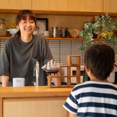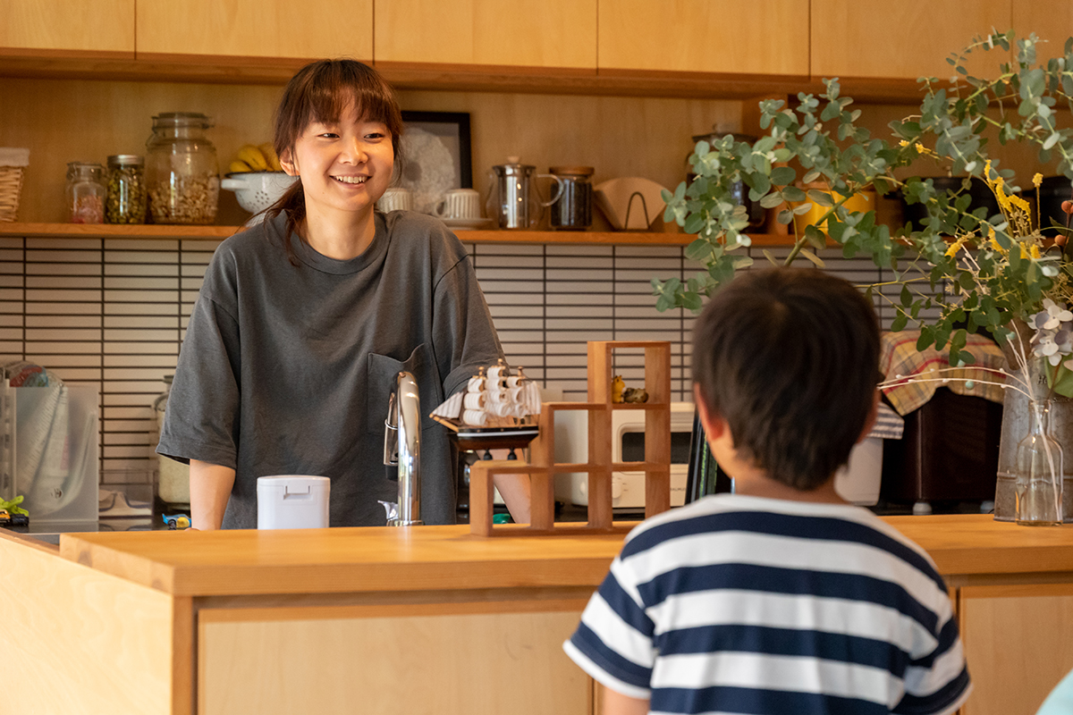 上でも書きましたが、動線が斜めなので広く感じます。両方向から行ける回遊性のあるキッチンとダイニングのおかげで子供達が積極的にお手伝いをしてくれます。このおうちに暮らし始めて生活は変わりましたか?