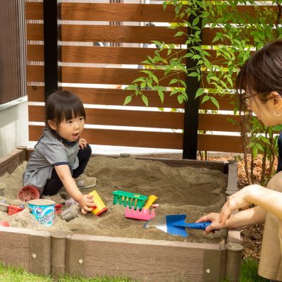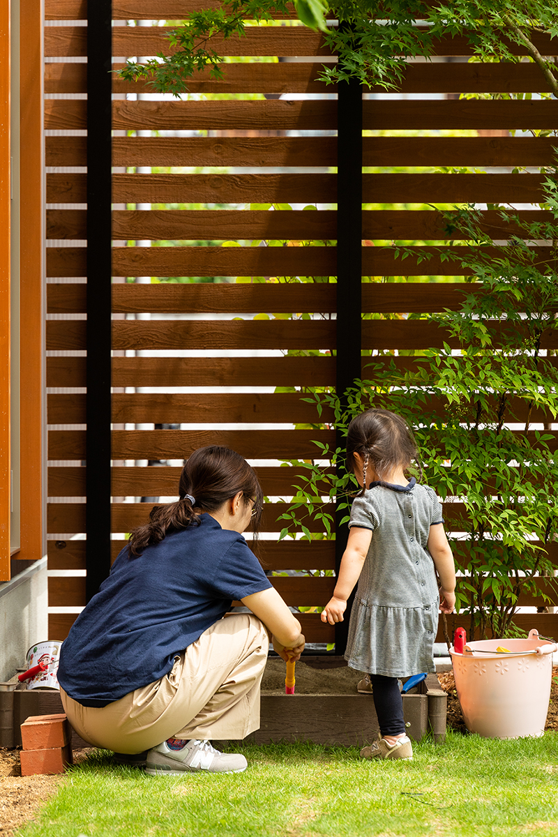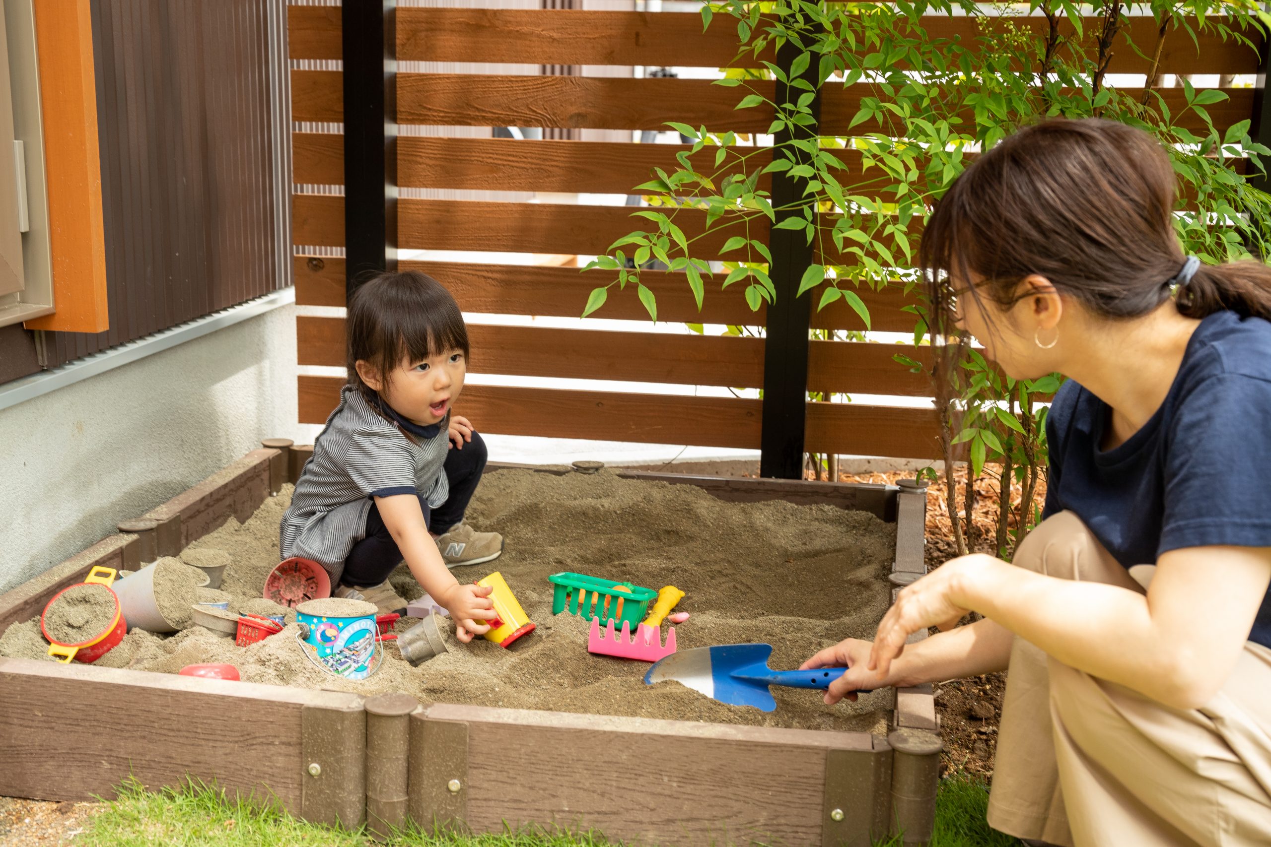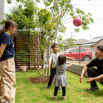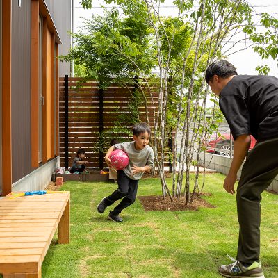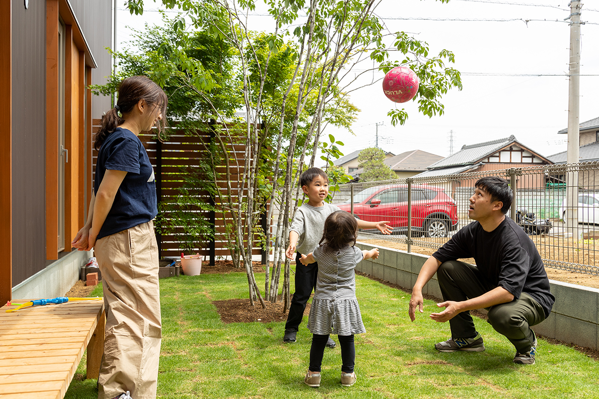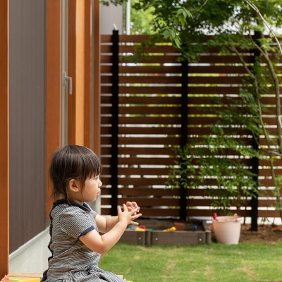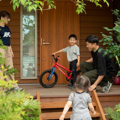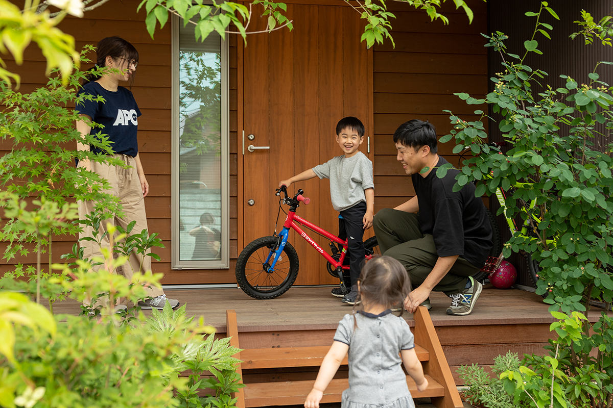 今までマンション暮らしだったため、子どもたちが、のびのび家を走り回っても気にならないことがすごく良いです。無垢の杉床なので足さわりも柔らかく、いつも寝転がっています。リビング、子供部屋どこでも走りまわっています(笑)。また庭やデッキもお気に入りのようで、頻繁に外に出るようになりました。かなり楽しく過ごしています。 二階リビングからつながるウッドデッキと玄関前のデッキスペースを活用して、外でおやつやご飯を食べることが楽しみになりました。ご家族、ご友人からの評判はいかがですか?