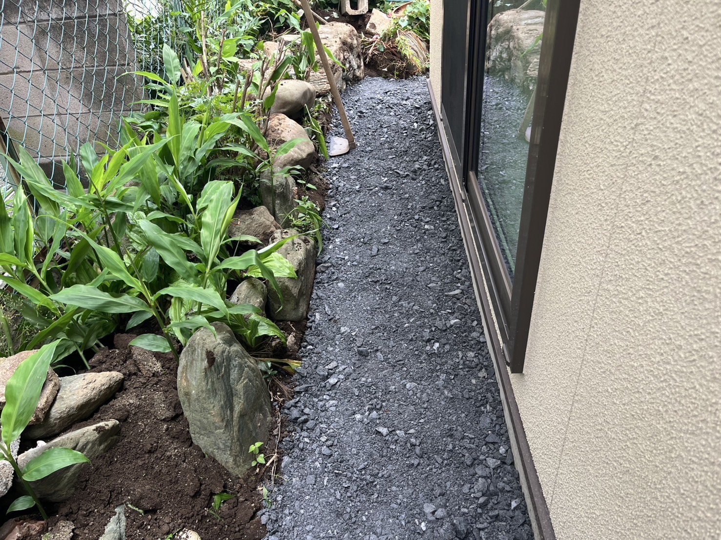 さらに、増築によって庭スペースが狭くなったため、既存の石を移動し、砕石を敷き詰めることで歩行時の安定性を確保。外への動線も快適に整えました。
