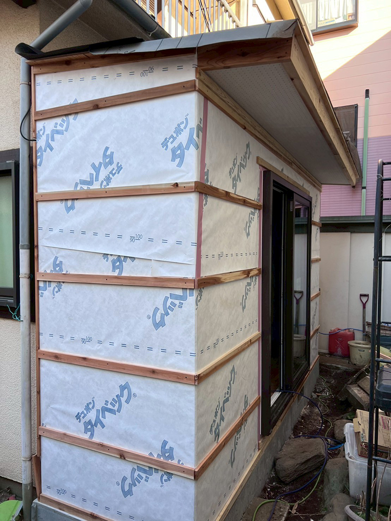 下地から造成し、断熱材もいれることで使いやすく快適なスペースに生まれ変わりました。外壁は母屋と自然につながるよう同様の素材を使用しました。