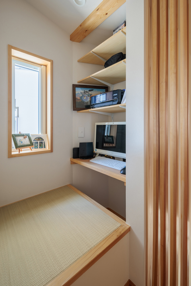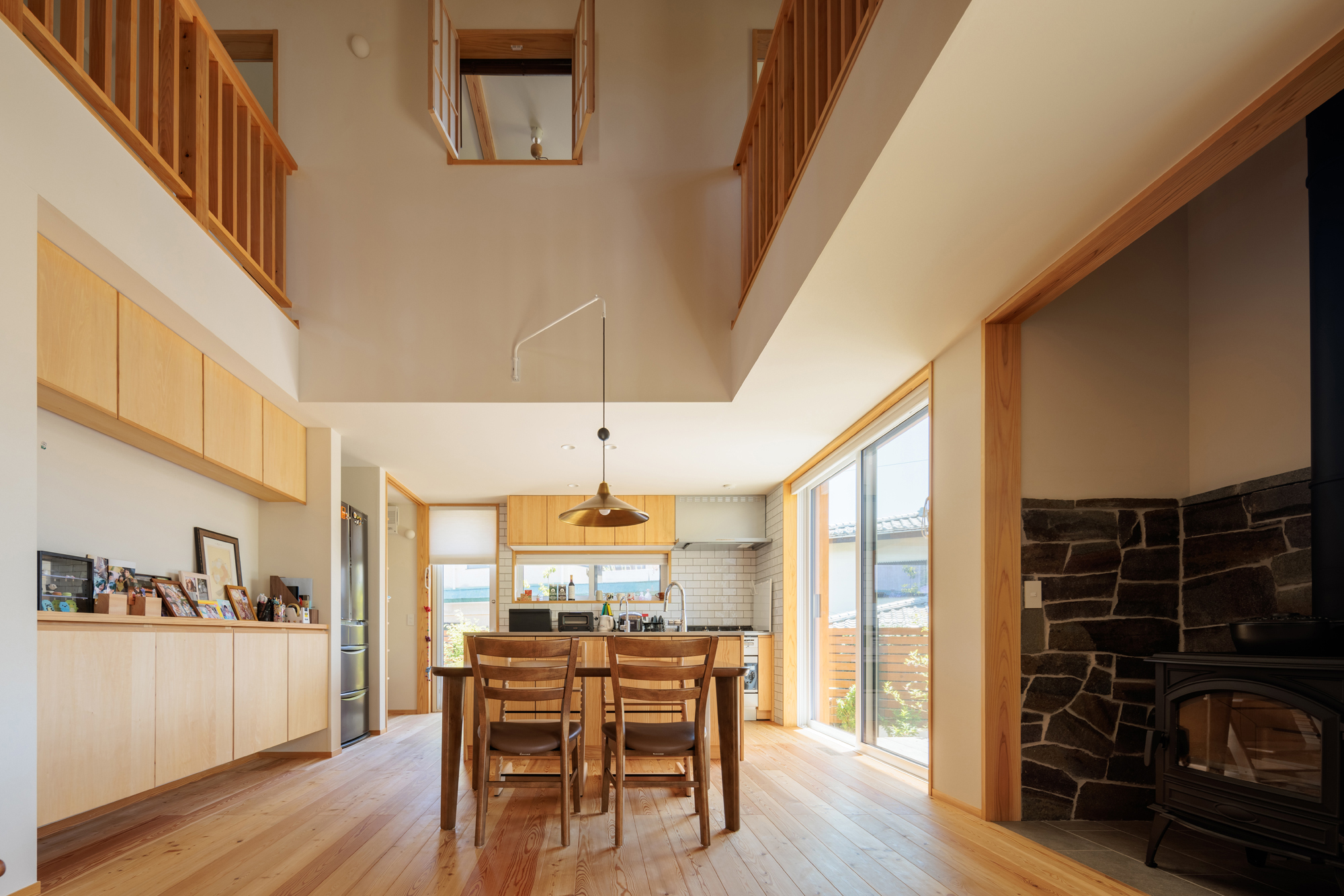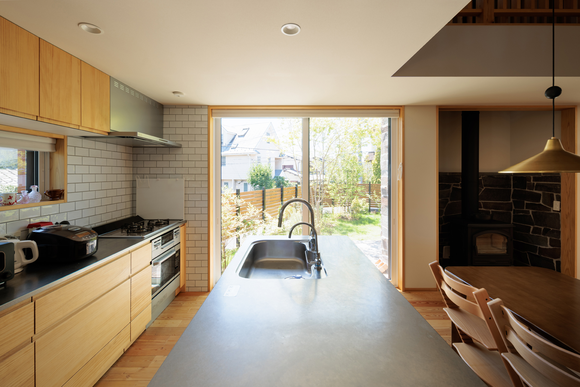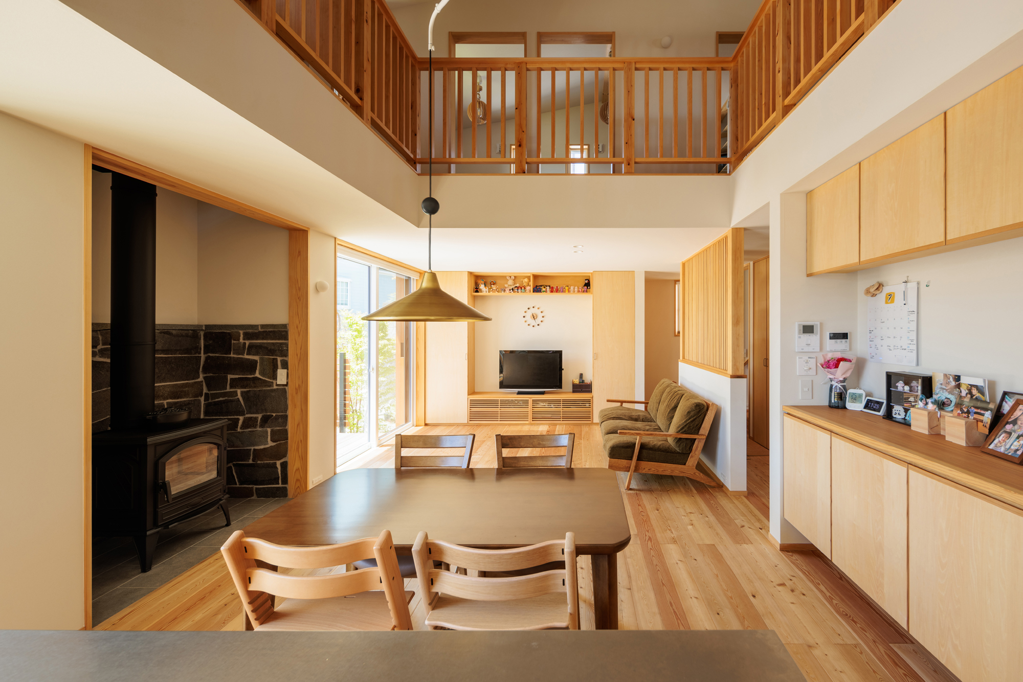 住宅性能評価:設計性能評価・建設性能評価 / 耐震等級3(許容応力度計算による) / 劣化対策3・省エネルギー対策等級4 / UA値0.44W/㎡K / C値0.13c㎡/㎡ / HEAT20(ヒート20)G2グレード / こどもみらい住宅支援事業計画地は多摩湖からほど近く、緑豊かな高台の住宅地です。きれいに区画分けされた敷地は東西南北に家が並び、普通に建ててしまうとお庭や景観が楽しめないため、南に家の角度を向けることで視線のかち合わない奥行きあるお庭を取りました。外観も漆喰、板張り、石張りとし自然の中にひっそりとたたずむように計画しています。また、アプローチから家がきれいに見えるよう配慮しており、季節の木々や草花を楽しめるでしょう。広く取れた回遊できるお庭では子供たちが走りまわり、家庭菜園や薪だななども作りとても楽しそうに暮らされています。クライアントご家族とは令和2年の8月に初めてお問い合わせいただきました。 同僚の方がこなから建築工房で家を建てていたことがきっかけでした。 その後、モデルハウスにご来場後にすぐ当社に決めていただいたのを今でも鮮明に覚えております。お祖父様が建てられたお家の建替えとなります。 とても素敵なお家でしたが、築年数も古く耐震も心配との事でのご決断でした。 高台になっており、眺望も良いのですが普通に建ててしまうと余白が無くせっかくの敷地が活かせません。 そこで敷地に対し、斜めに建物を振ることで東西南北の余白を取る計画としましました。 完成してみると角度を振ったことにより、南側に広いお庭が取れお隣との目線もずれてとても落ち着いた生活が送れるようになったように感じます。外観は真っ白な漆喰を主に、煙突部は鉄平石、玄関周りには無垢板張りで柔らかさを出しています。こなから建築工房では初めて採用した外壁の天然石(鉄平石)張り。 このお家の良いシンボルとなったように思います。また漆喰や無垢板との相性も良く、雑木のお庭とよく合う、自然に溶け込む外観となっております。構造は埼玉県飯能市 の『西川材』檜を使用し、床材はカラマツ無垢板を使用しています。カウンター材にも杉無垢材を使用しております。 こなからでは手に触れるもは全て天然素材にこだわっており、塗料も溶剤等一切使用いたしません。子供たちも小さいため本物の素材に触れ、本物をしる大人になっていただければと思い素材にもこだわっております。断熱は完全外張り断熱で施工しており、暖冷房はルームエアコン1台で家全体をまかないます。『彩りの家』は許容応力度計算による構造増計算を基礎・躯体共におこなっております。 耐震等級は最高等級3を許容応力度計算により確保。 気密測定も実施し、0.13c㎡/㎡と高気密実証済みです。 住む人にも家計や自然にも優しい家となっております 。仕様