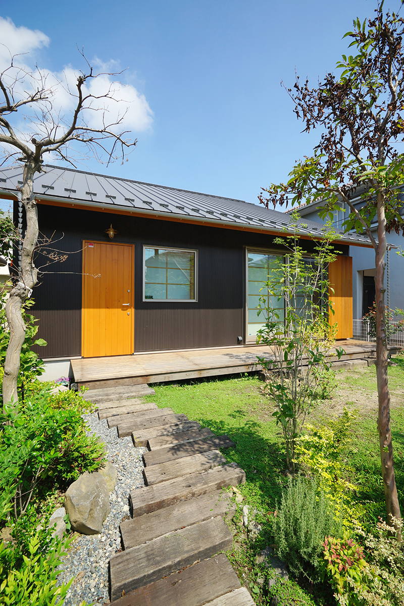 庭作りにもこだわりました。建て替え前から植わっていたモミジやヒメシャラ、モモの木などを根巻き保存し植樹しています。