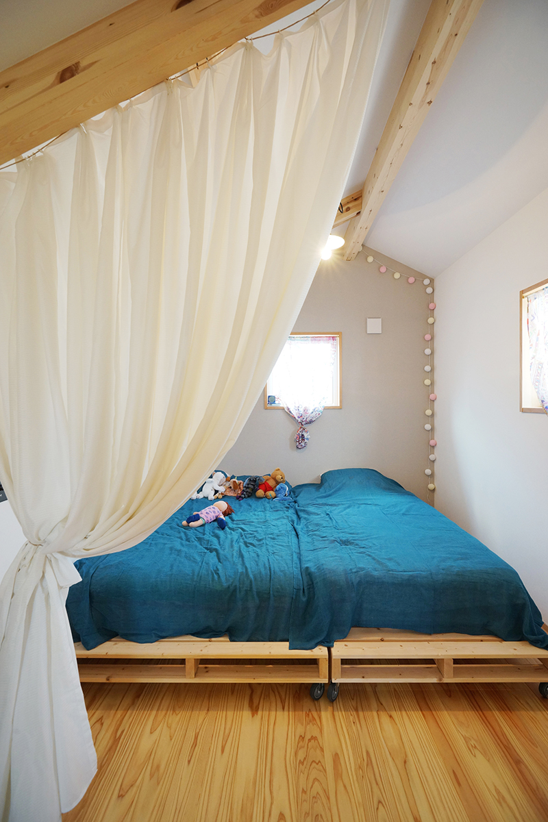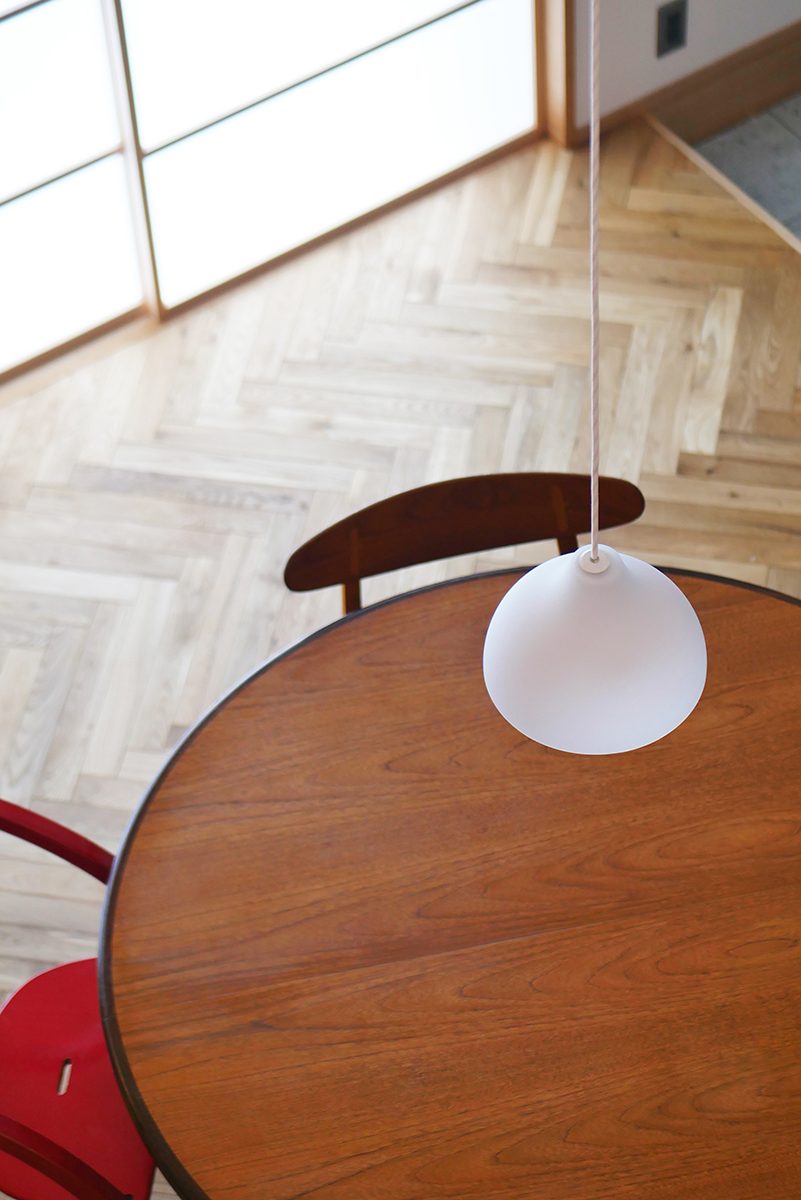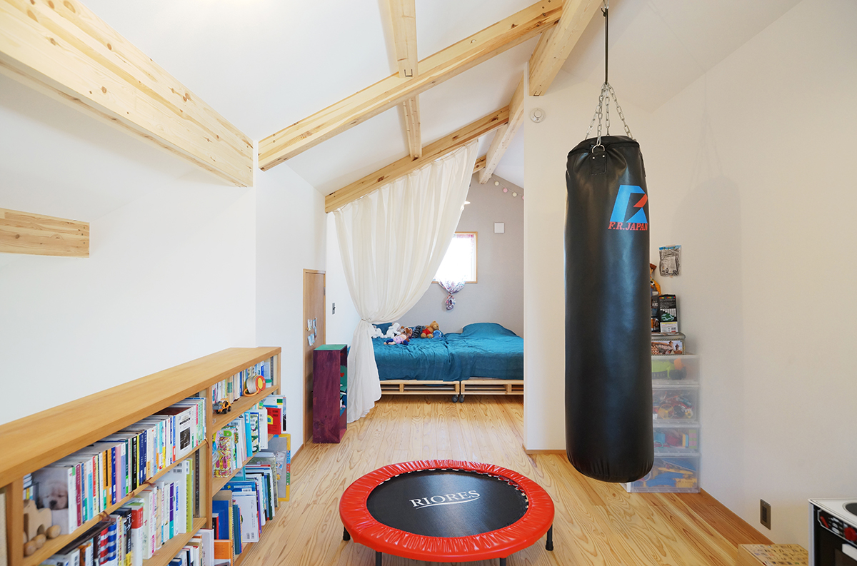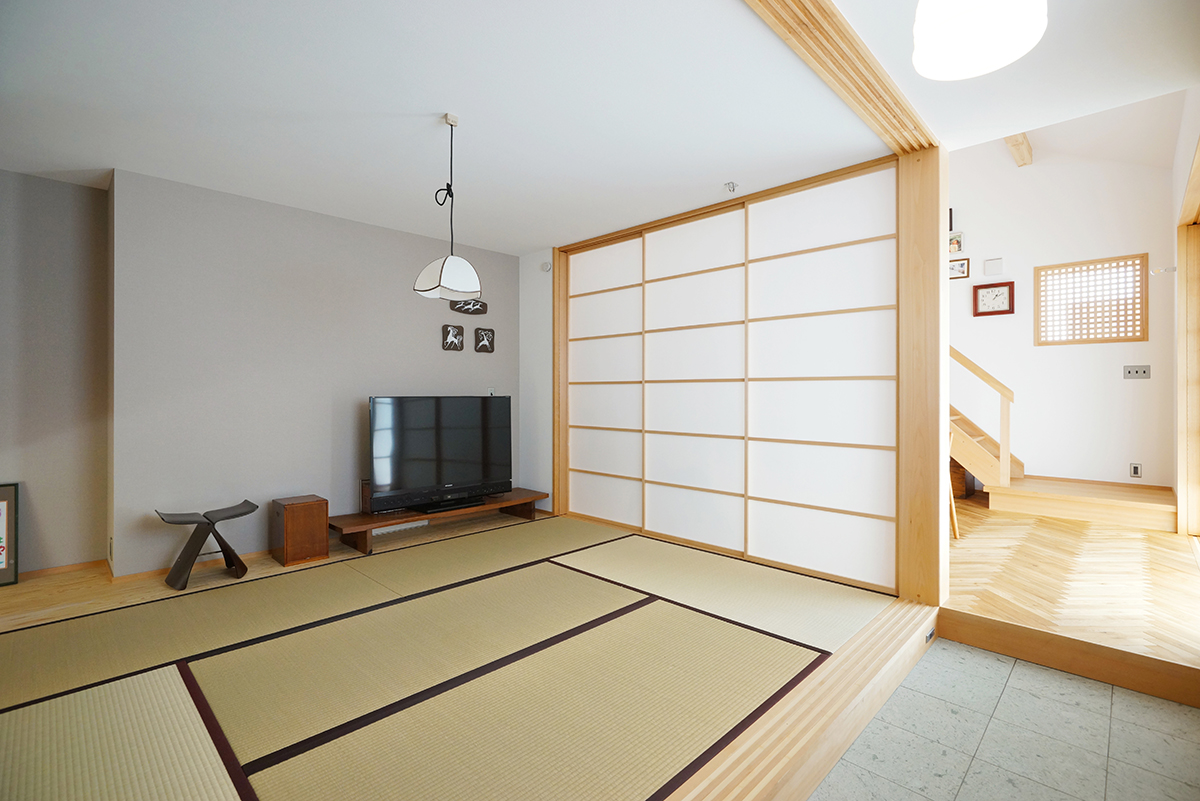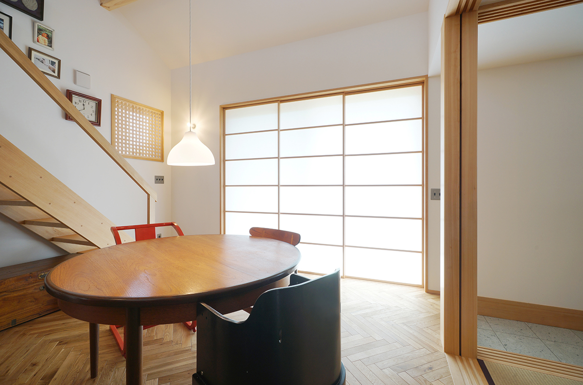開放感ある吹き抜けのダイニング、その横には和室のリビングがつながり障子で空間構成を変えることができ、2階は小屋裏部屋をイメージした子供たちのスペースとなっています。