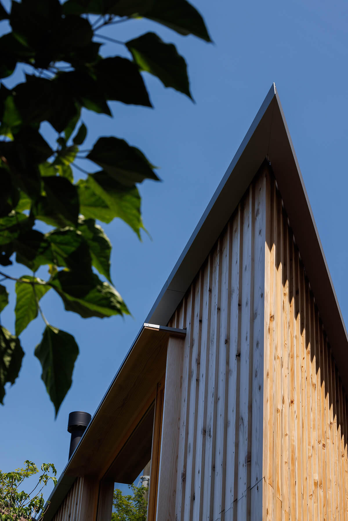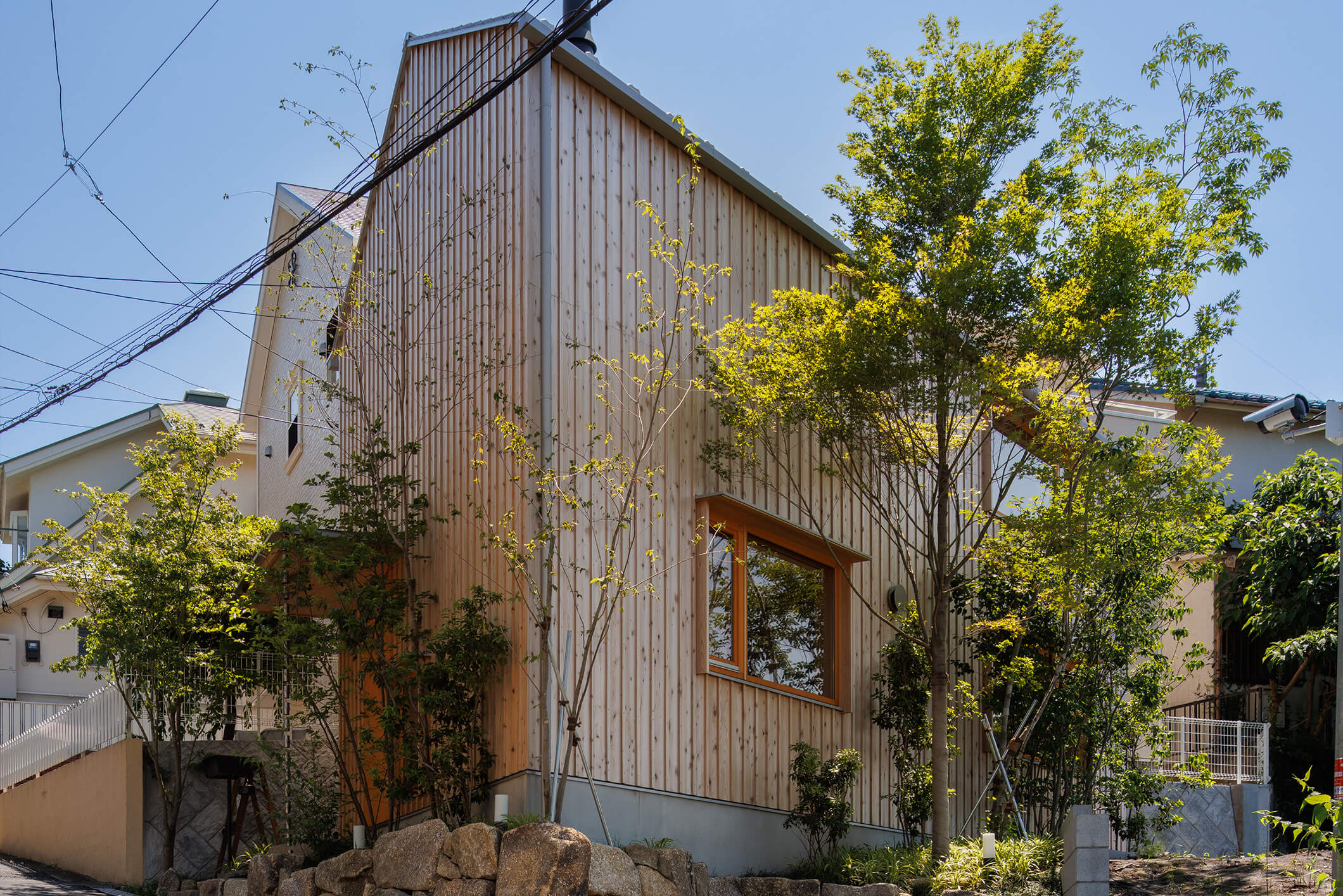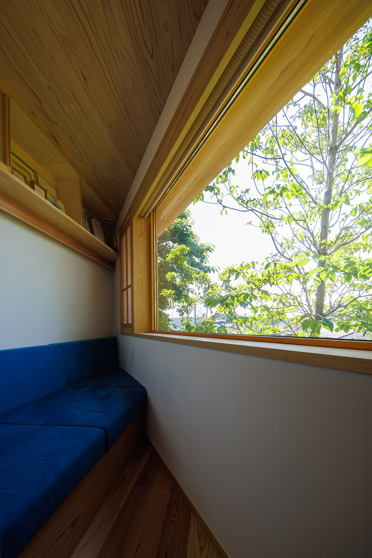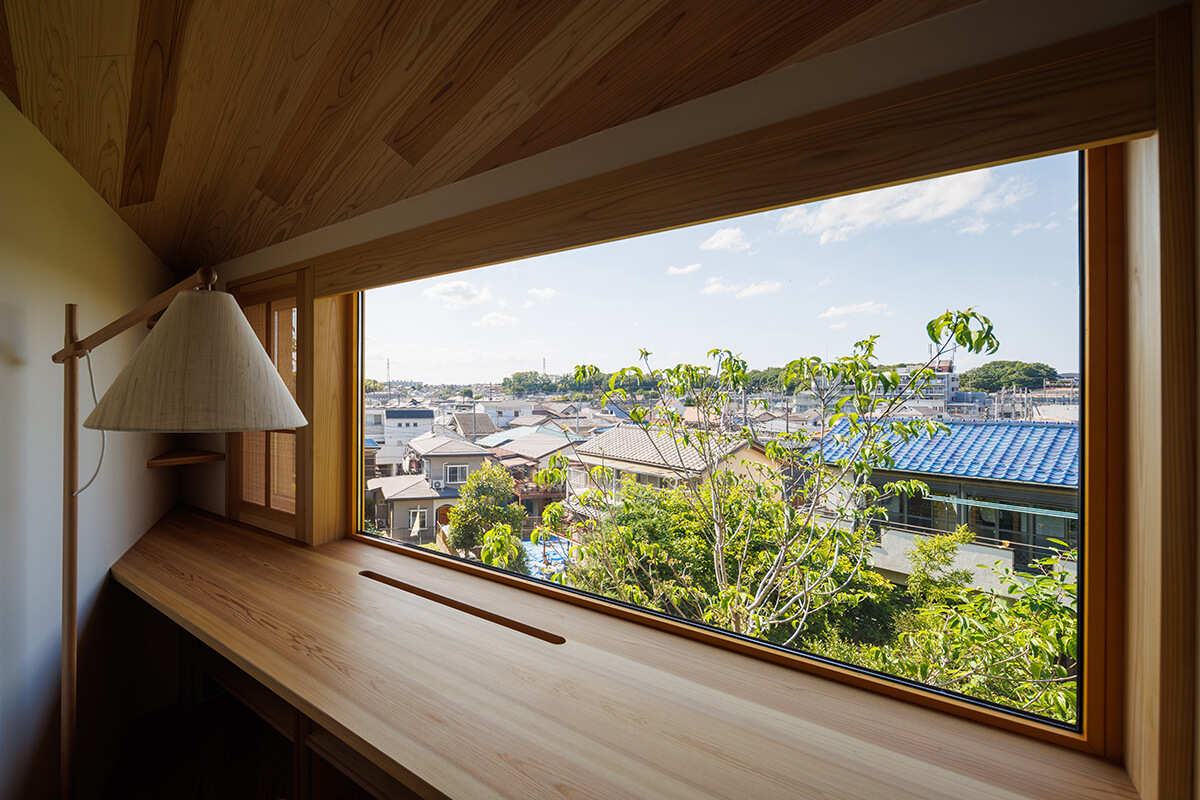 建築計画の途中で、北側の土地を買い足すことが出来たため駐車スペースを確保出来ました。計画地は東京都内であり、建蔽率は50%、容積率も100%と狭小の土地であった為、かなり厳しい条件でしたので、プランの作成に当たり、狭さを感じさせないように開口部の位置を計画し、こんな土地でも快適で素敵な家が建つということを分かっていただきたいという想いで設計いたしました。計画地の北側は崖地となっており、見晴らしがとても良く、隣家とも距離があったため、最大限景観を楽しめるよう計画しました。 しかし、前面道路の勾配がかなりきつく、坂下(北側)から登ってくる通行人に圧迫感を与えかねないと思い、計画高さを抑えることと、角が正面に来るように配慮しました。通常の木造軸組みでの許容応力度計算では耐震等級3の確保と、希望する吹き抜けの大きさを実現できなかったためSE構法を採用しました。そのため耐震等級3の取得や吹き抜けを両立させることが出来ました。外部空間を最大限楽しめる開口部。冷暖房を使用しない時期に窓を開けた際には、簾戸が網戸の役割も兼ねてくれます。