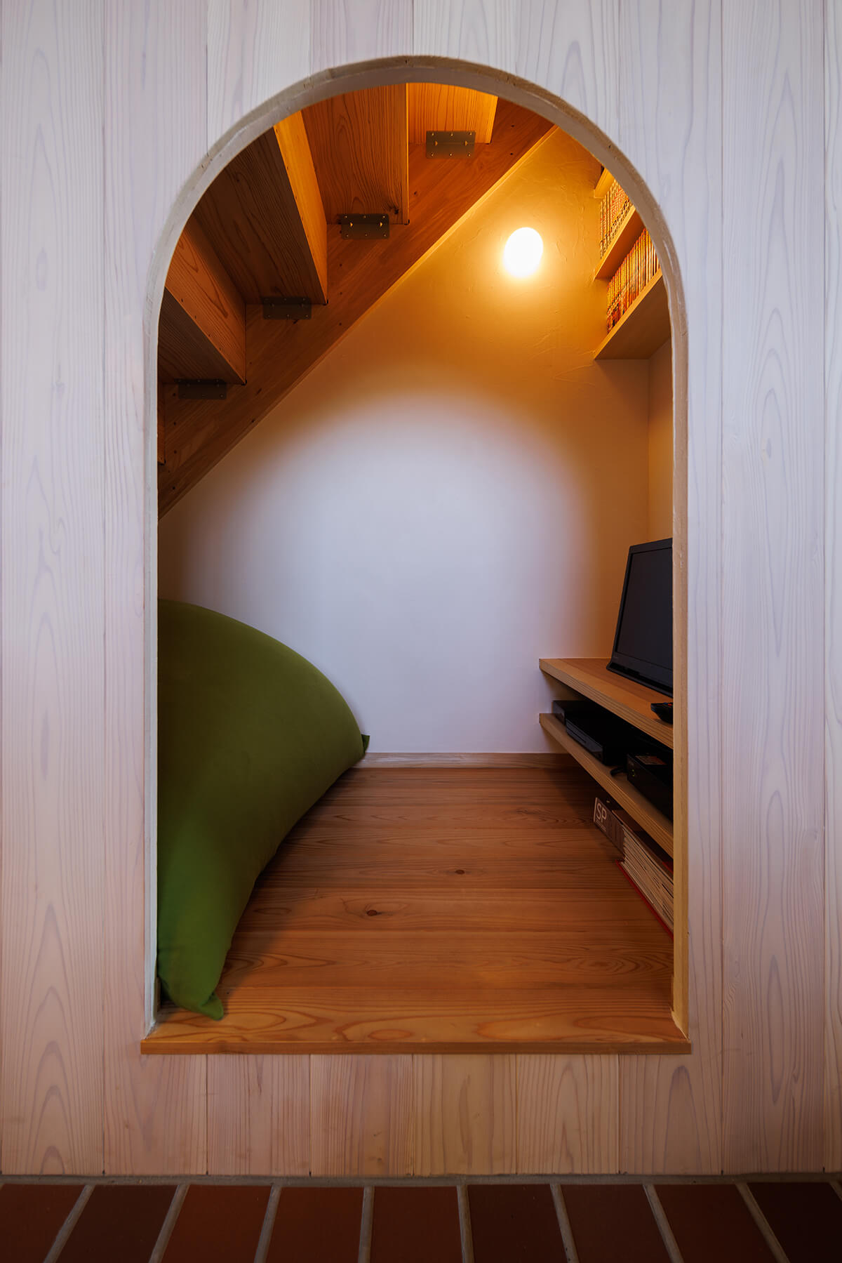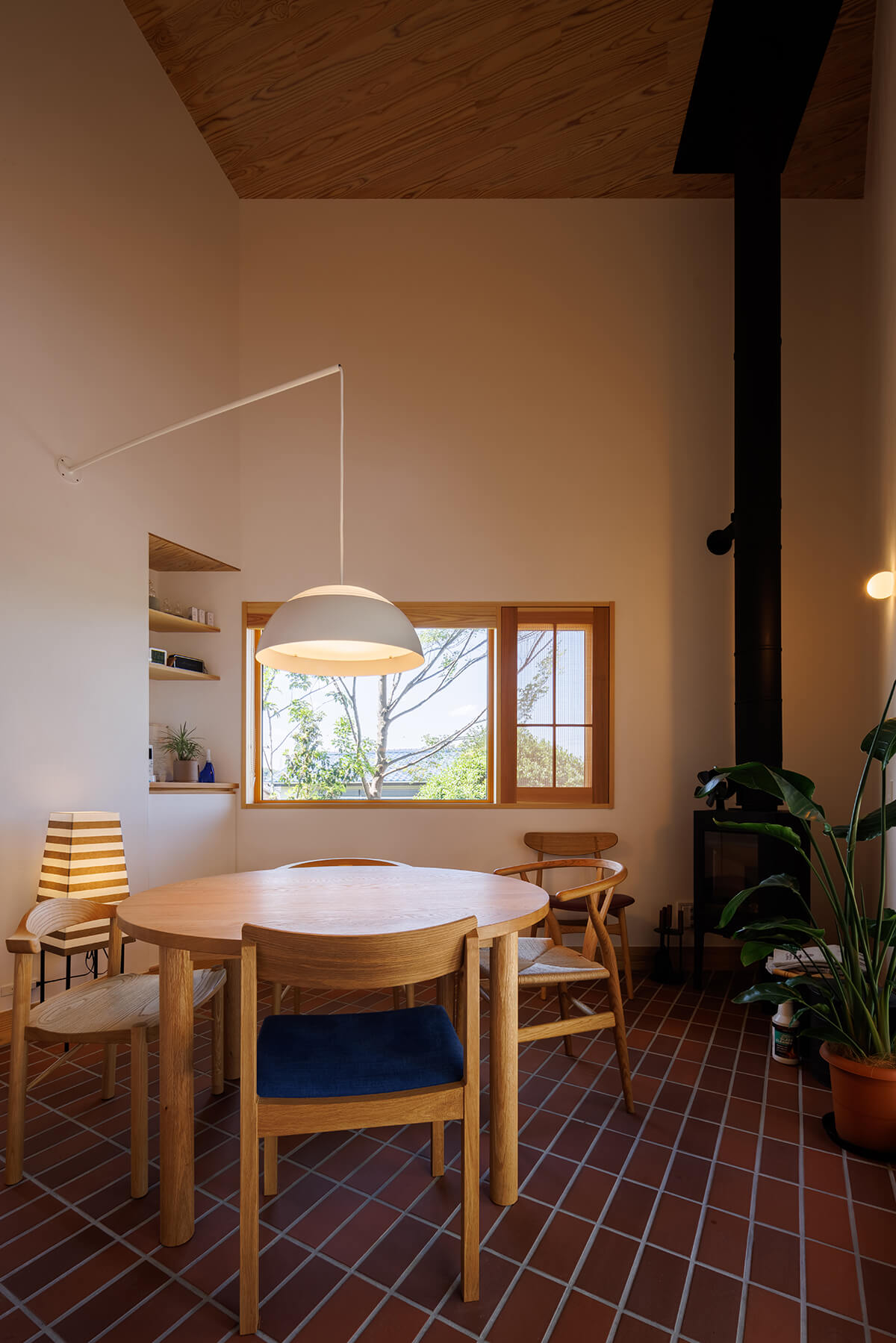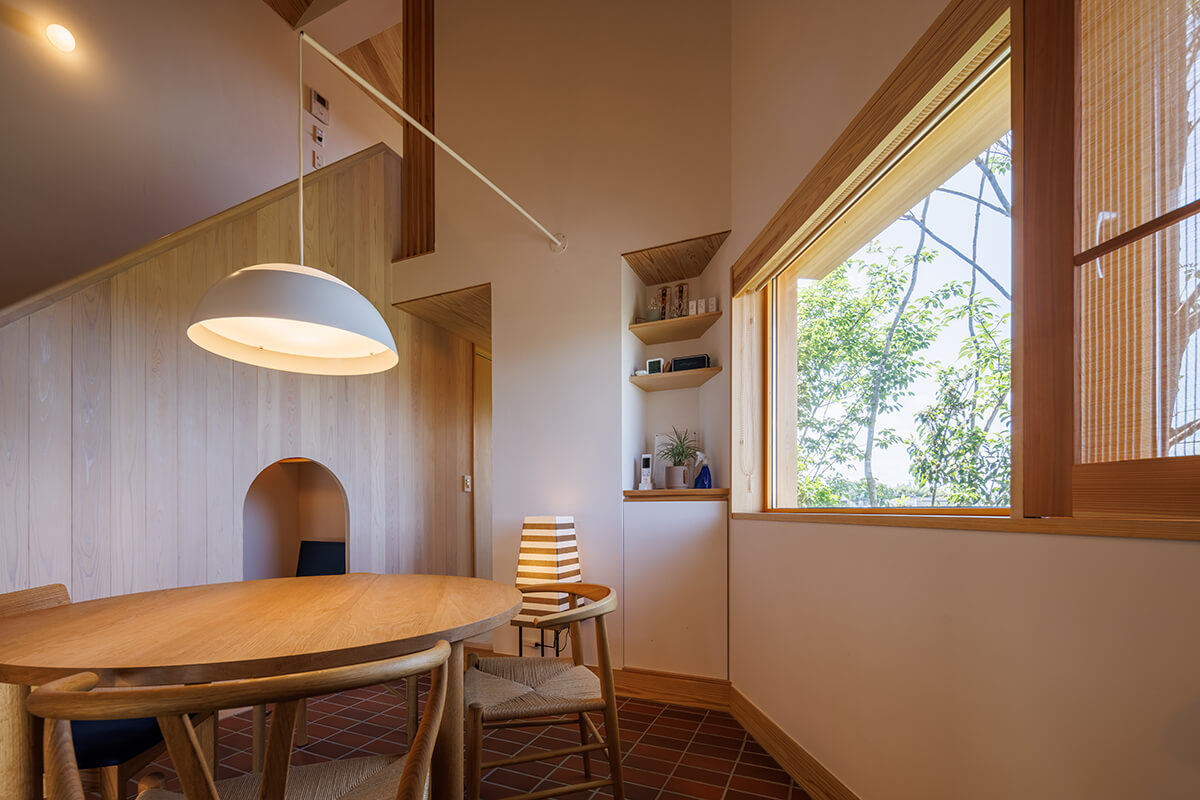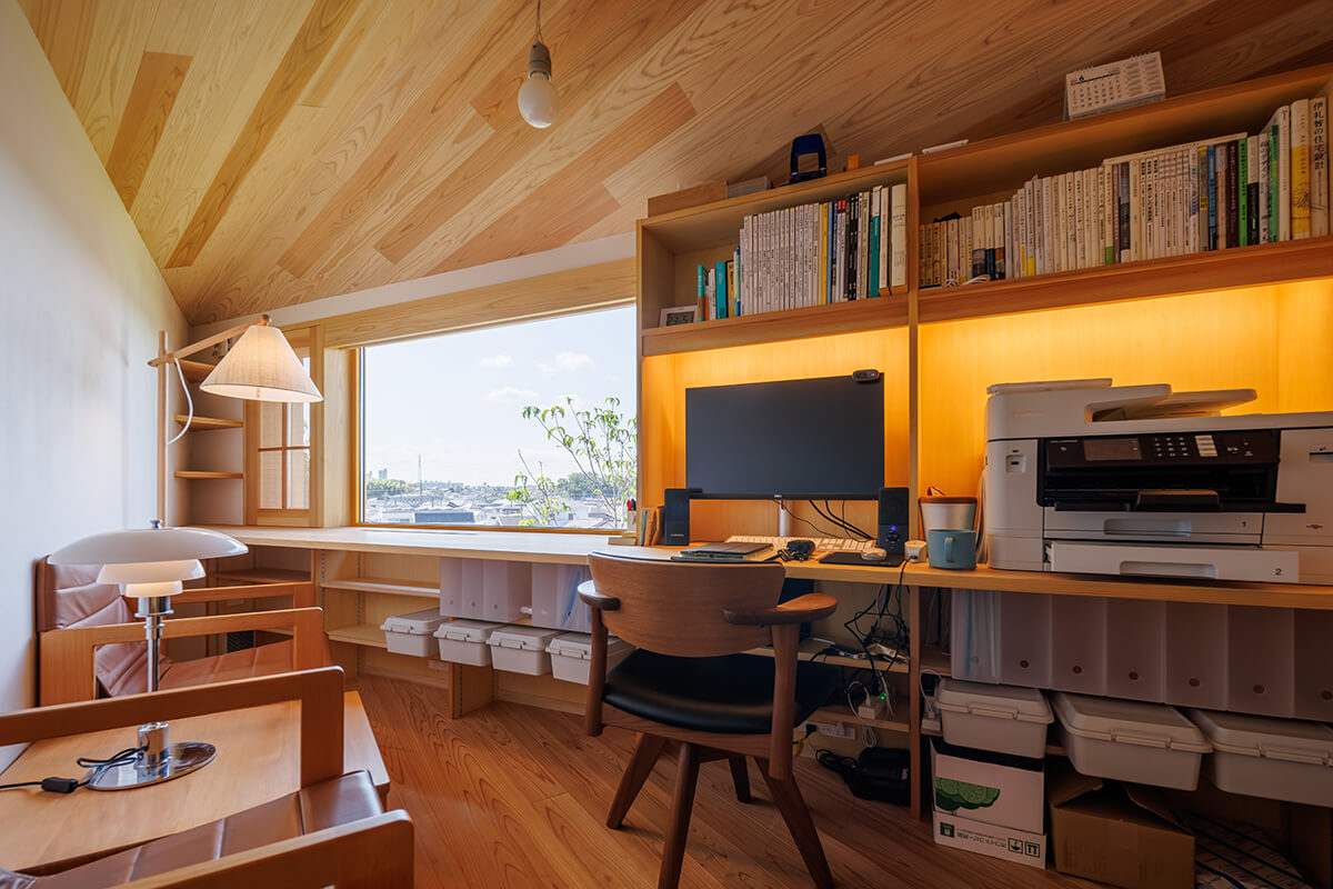 南側が高台となっているため、二階建てのお家が建っていて南側の採光が望めない立地でした。今回の用途はモデルハウス兼事務所ということもあり、北側の安定した光を取り入れる計画としたことで一日中柔らかな採光に包まれています。北側は地盤面がかなり下がっていることもあり、見晴らしも良くパソコンで疲れた眼を優しく癒してくれます。本物の火の暖かさを感じられる薪ストーブと、打ち合わせ時に子どもたちがDVDや漫画を楽しめるように計画された階段下のヌックや、造作の家具により建物の形を活かしたキッチンと、庭の木々を楽しみながら読書やお酒を楽しめる憩いのコーナーなど様々な工夫を凝らしたインテリア計画です。カウンターや床材には、近隣の埼玉県産材【西川材】を使用することで、運搬による二酸化炭素発生量の削減に貢献しています。仕様