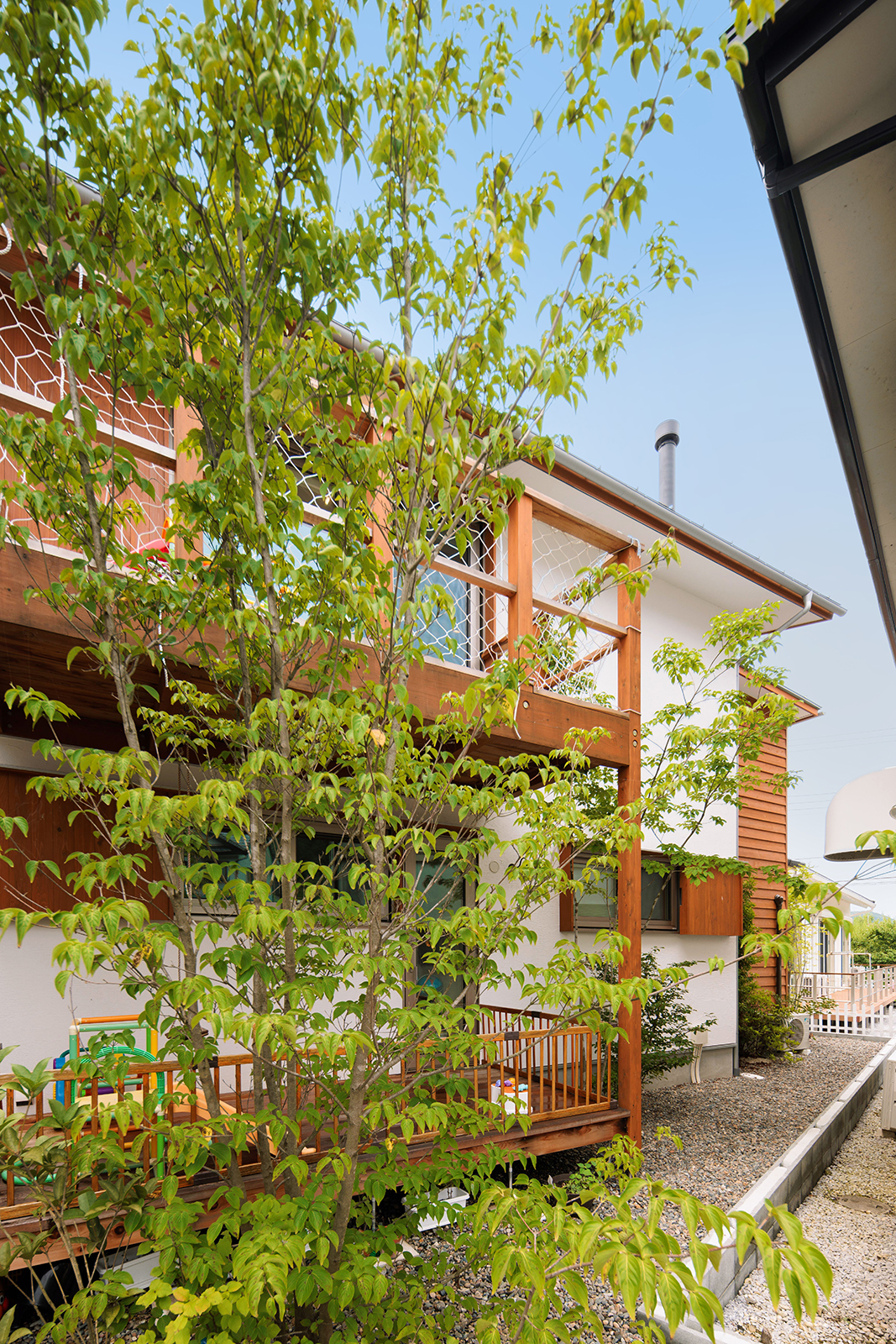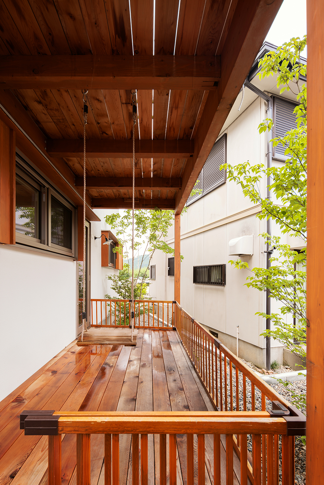 1階は日当たりも悪く、景観が望めないため寝室や子供室を配置しました。子供室から出れるウッドデッキを設け、ブランコを設置していつでも外を楽しめるようにしています。