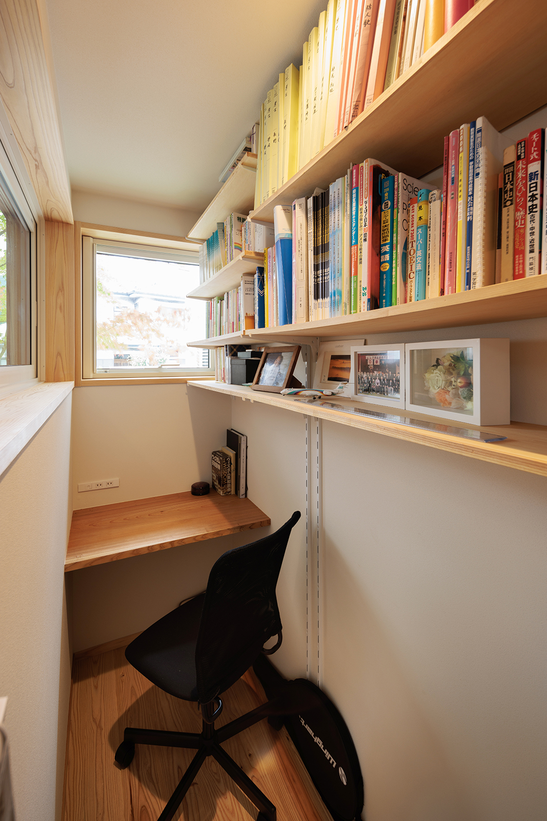 寝室からは、ウッドデッキを介してつながる書斎を設けました。一人で集中したいときは家族の気配を感じながらも、木々を楽しみながら集中できる書斎となりました。