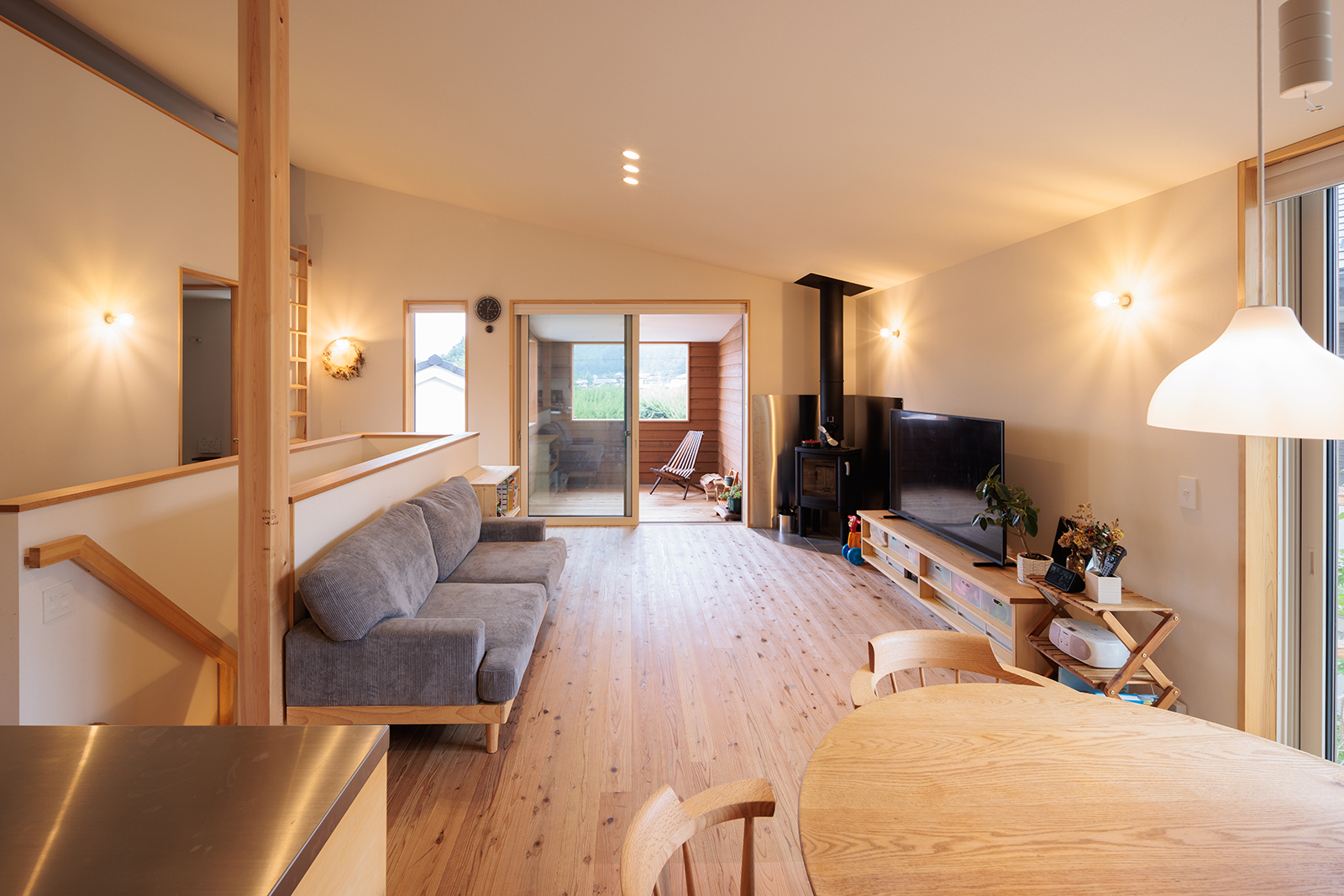 キッチンから続くダイニング、その横にはウッドデッキを設けてその先にある梅林を楽しめるような設計をしました。