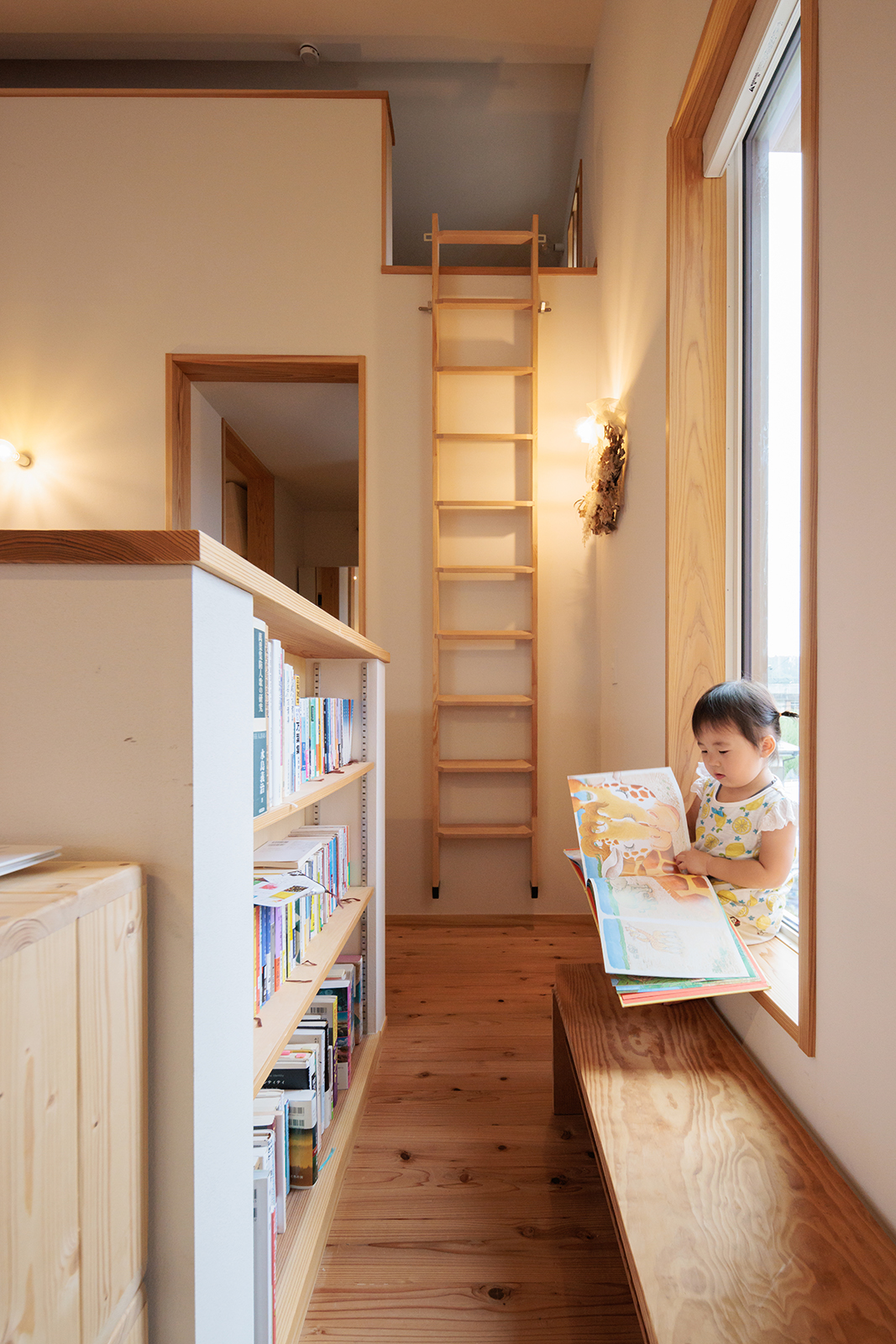 窓の横に設けた本棚とベンチ、ここは子供たちのお気に入り。
