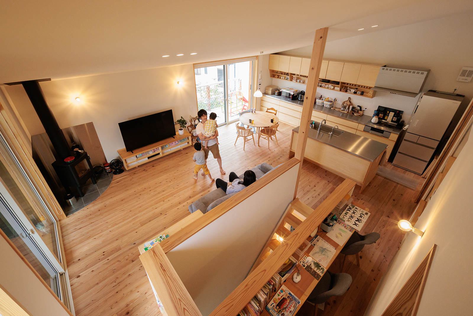 2階は広々ワンルームとすることで、まだ小さな子供たちに目が届くように考えました。キッチン前に設け勉強コーナーは大活躍!家事をしながら子供たちに声を掛けられます。
