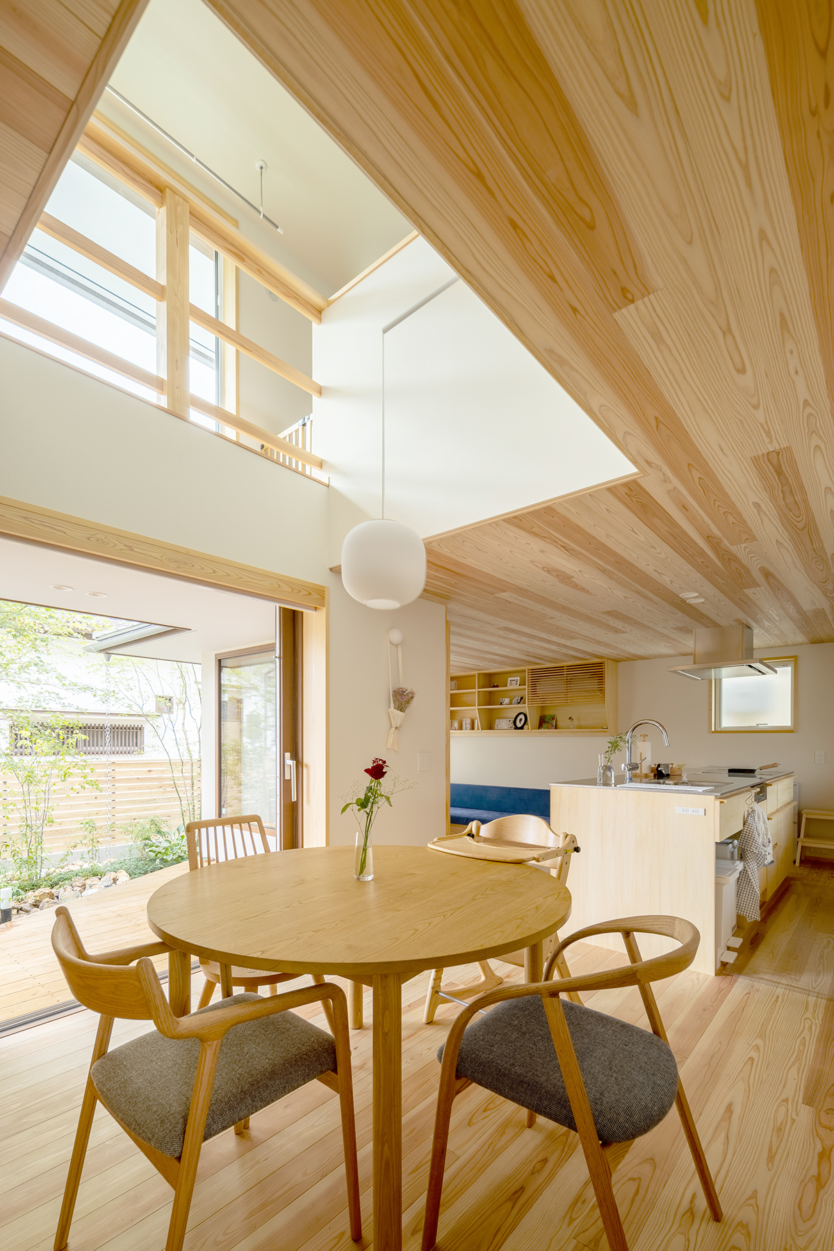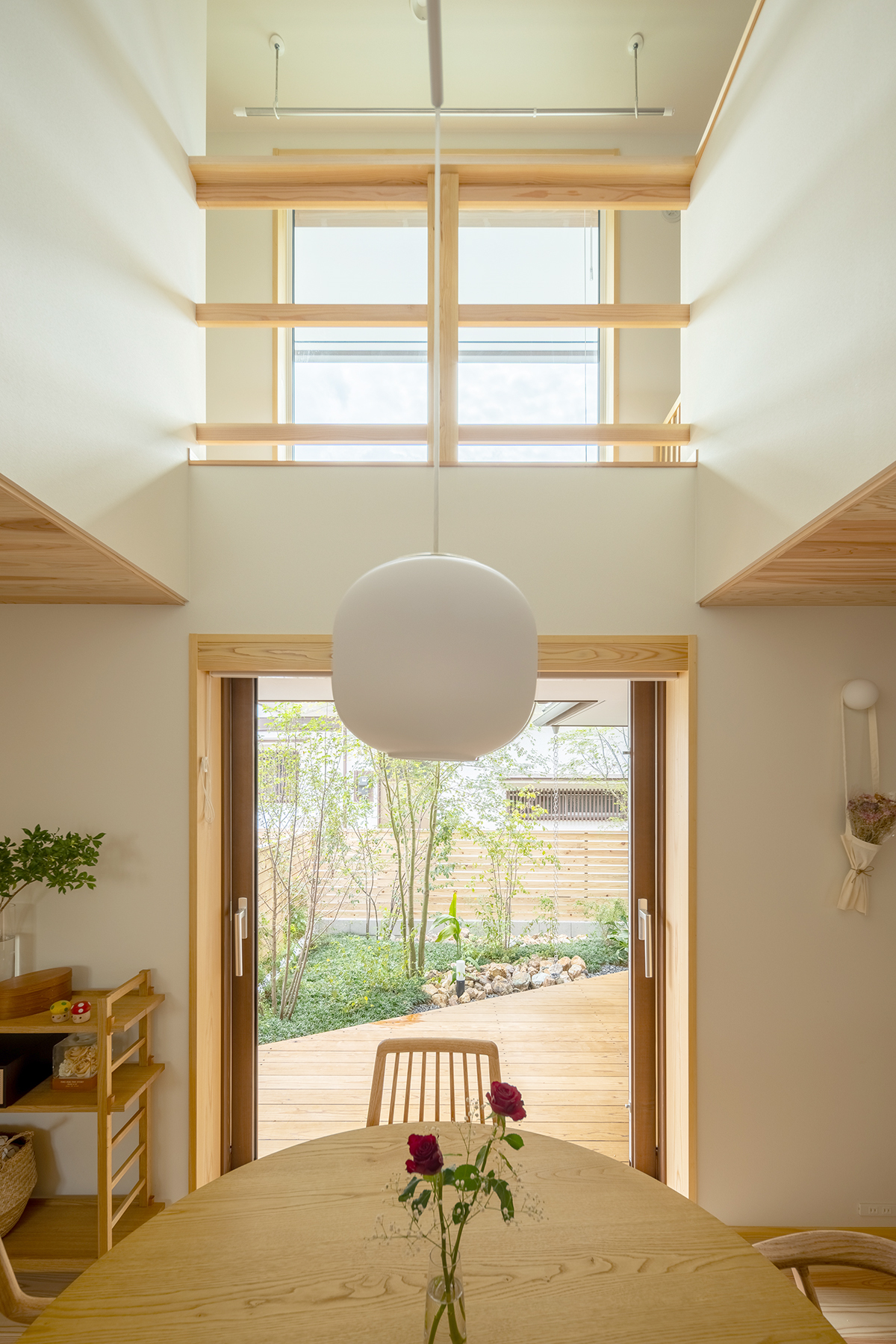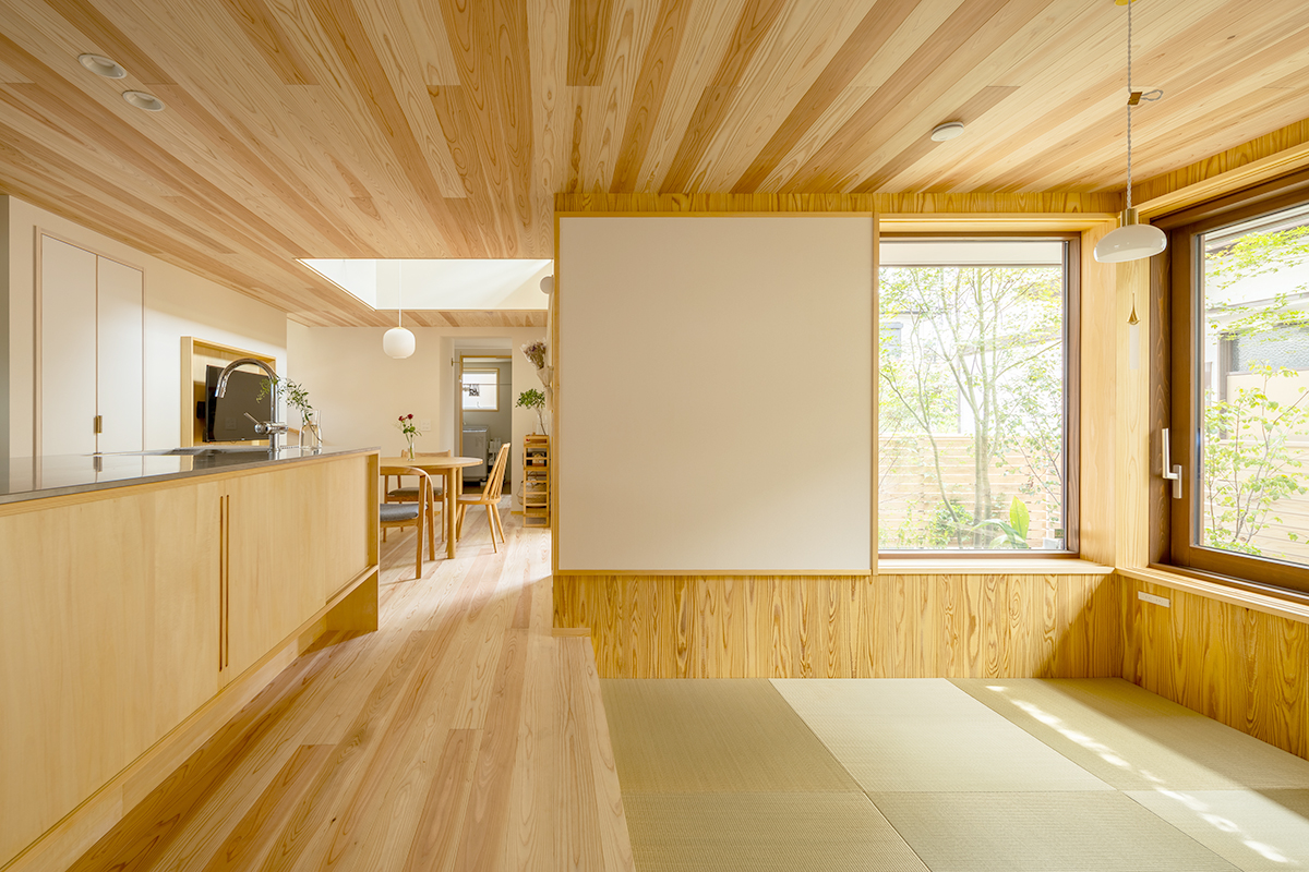 建設地は、埼玉県狭山市。 自然のやわらかな光をめいいっぱい取り入れ、明るくあたたかな空間が完成しました。家族とゆったりと過ごせるダウンフロアの畳コーナーのマドからはお気に入りの庭が眺められ、時間がゆっくりと過ぎていくような快適な住心地を実現しました。