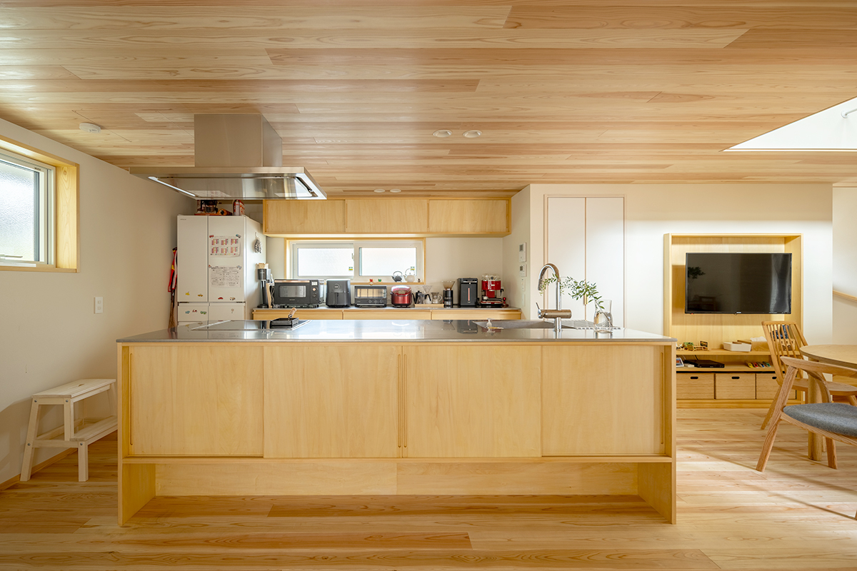 ダイニングキッチンには大きなアイランド型のキッチンを採用することで全体をフラットに構成。空間を広く見せるとともに、家族とコミュニケーションの取りやすい団らんの形を実現。