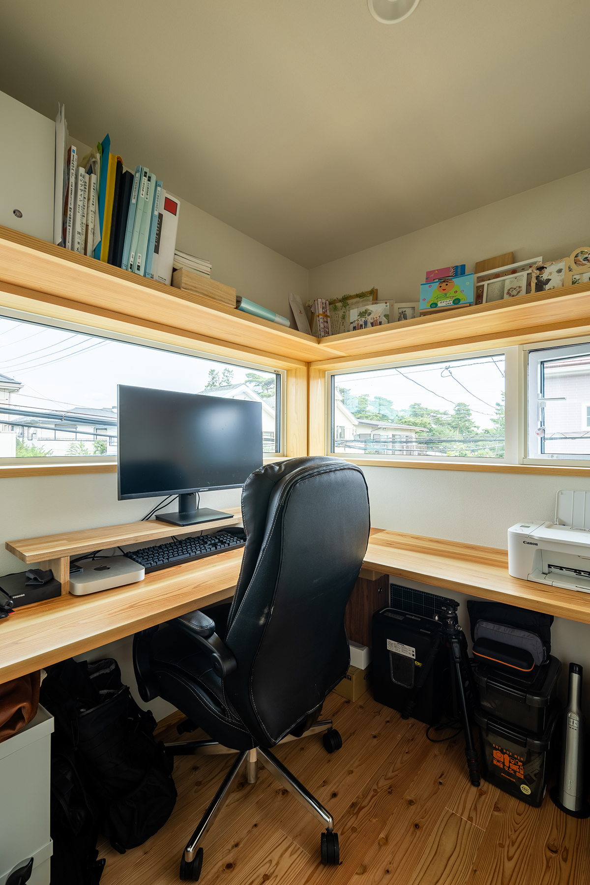 2階には書斎スペースを設け、在宅ワークや趣味の時間を満喫できる空間に。吹抜けからはリビングの様子を伺え、2階にいながらも家族の気配を感じることができます。