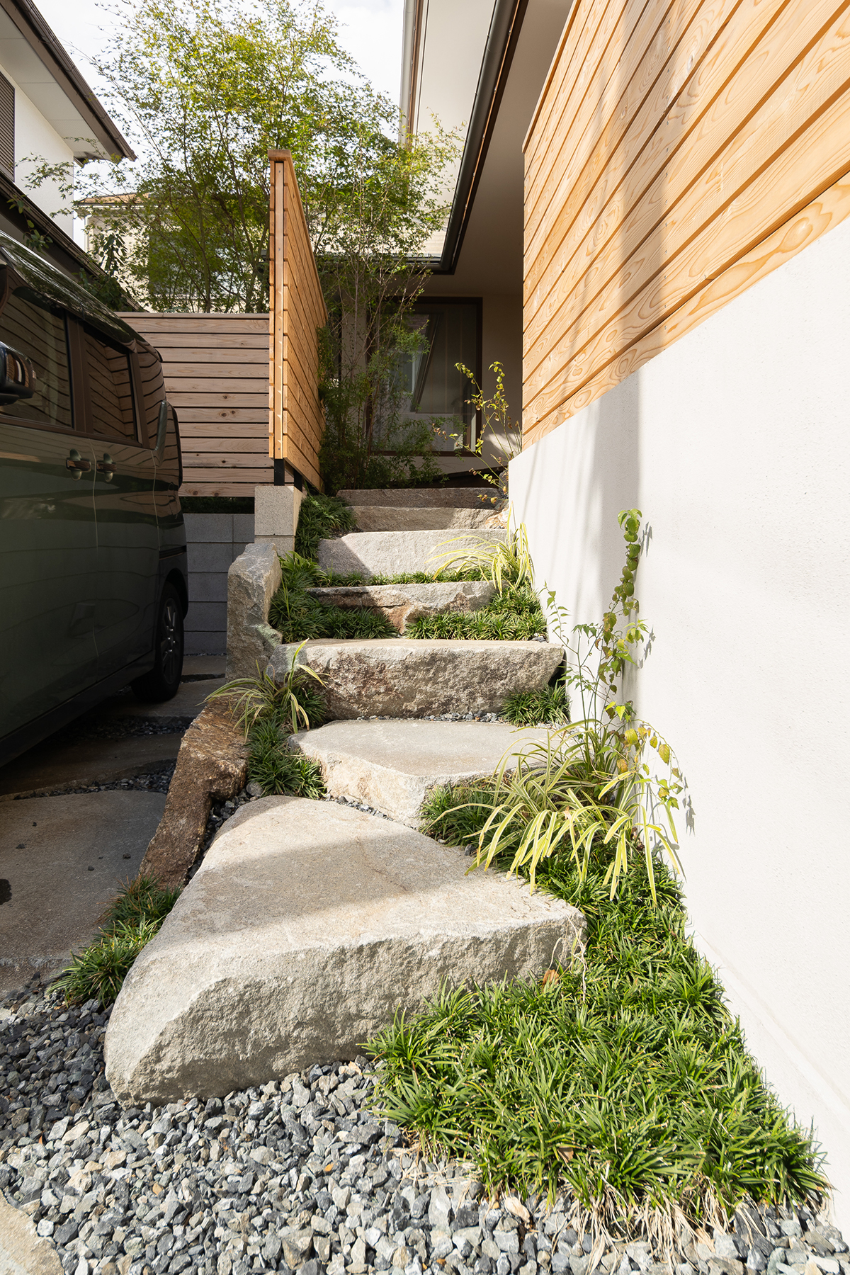 玄関アプローチの石積の階段や庭の造作には自然の形を活かした石を使い、暮らしの中に自然を感じられる豊かな暮らしを大切にしています。